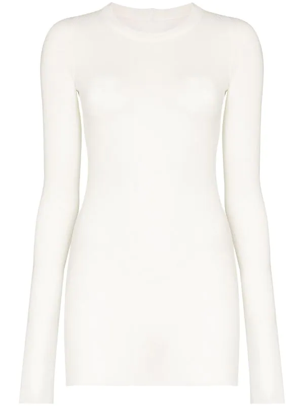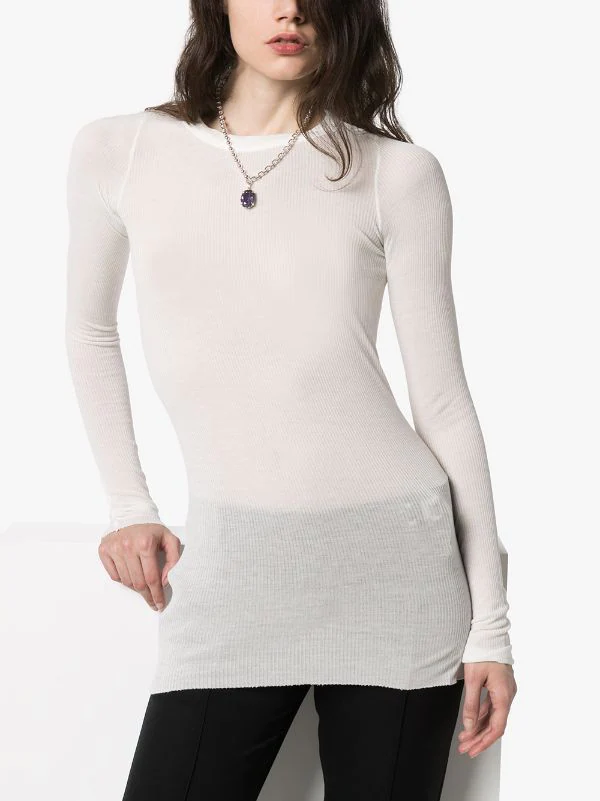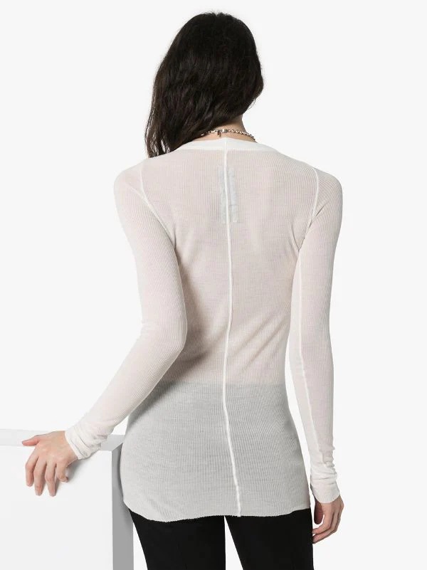 T-shirt nervuré à manches longues Rick Owens avec encolure ronde, manches longues, bonnets moulants à baleines et tricot à nervures.