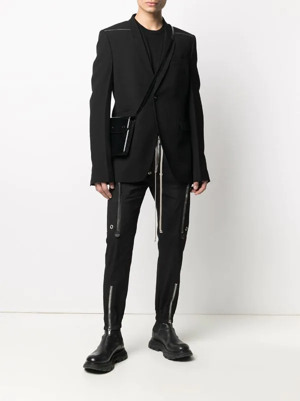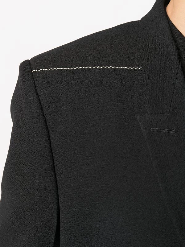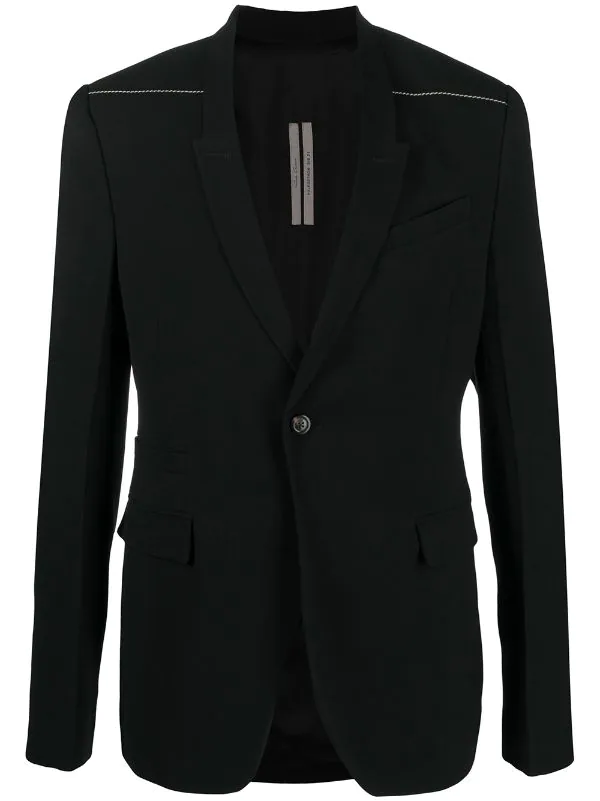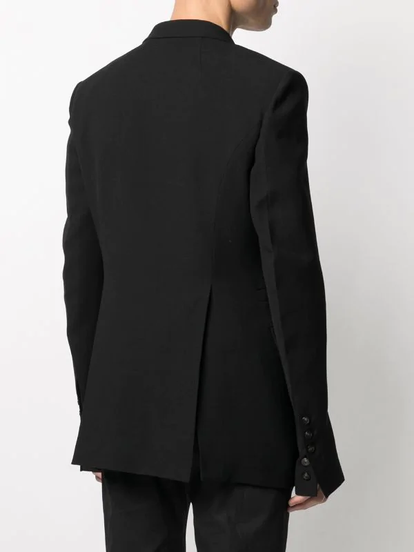 Revers crantés étroits, boutonnière sur le devant, manches longues, poignets boutonnés, poches devant à rabat, double fente arrière. Couleur : noir. Matière : laine.