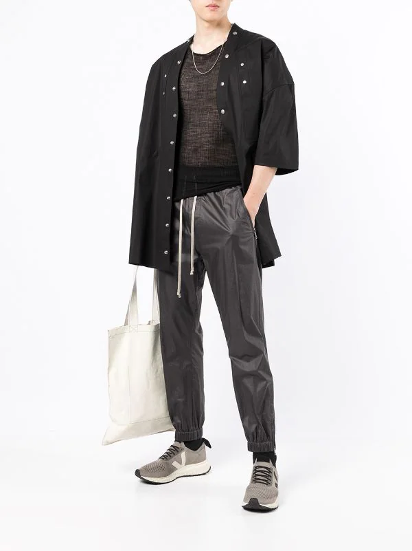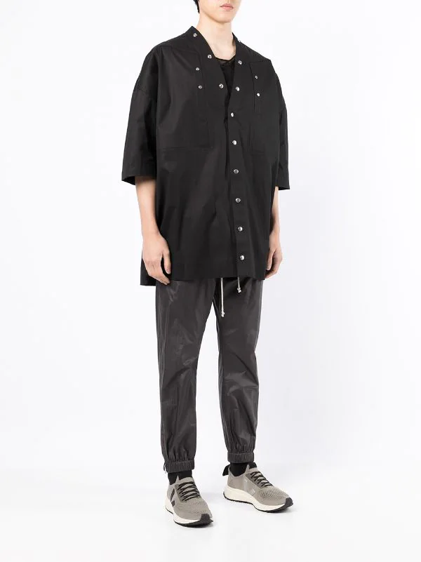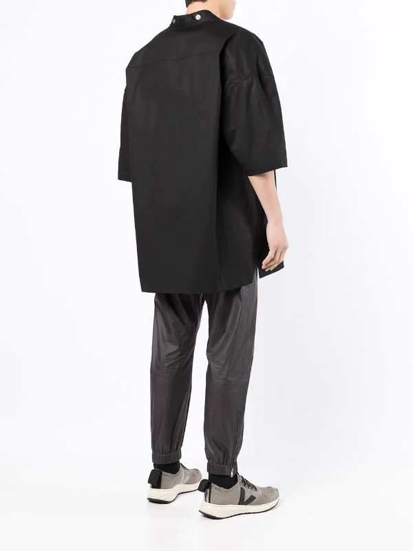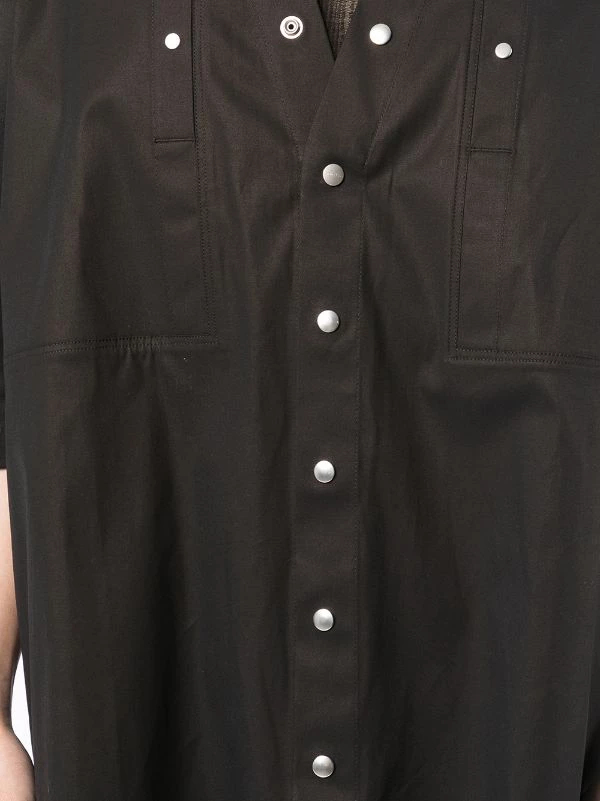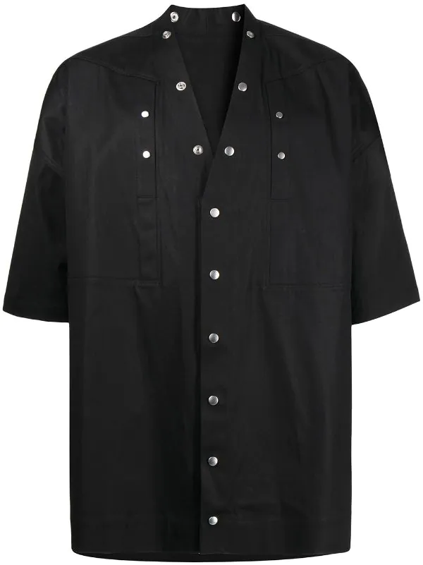 Col v, boutonnière sur le devant, manches courtes, ourlet droit.