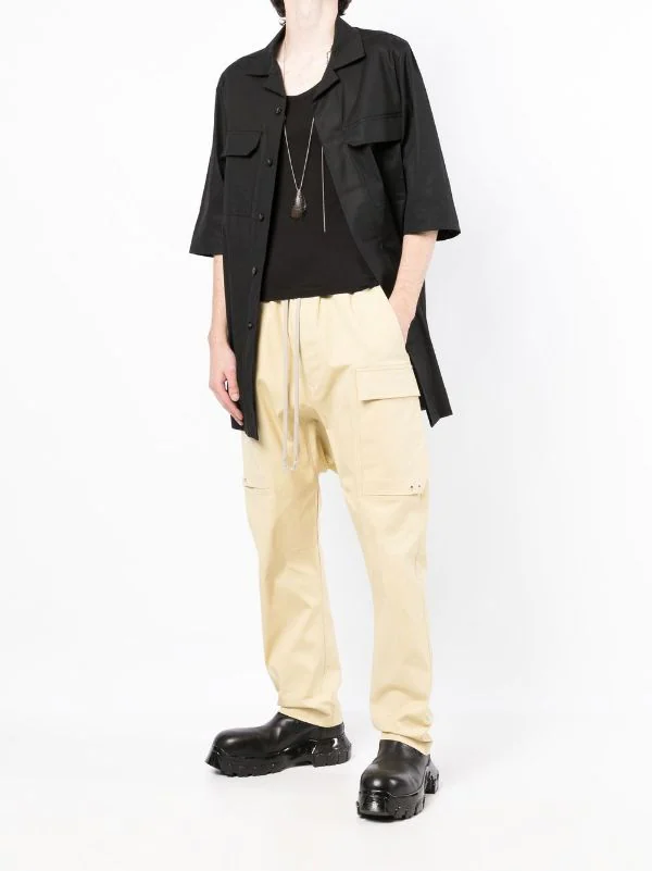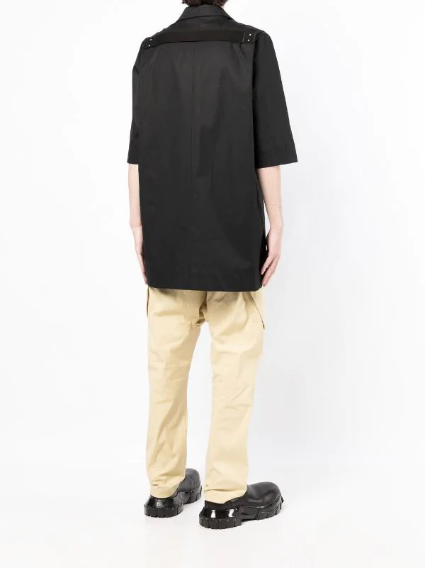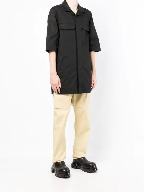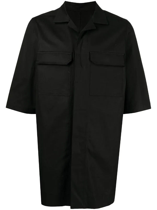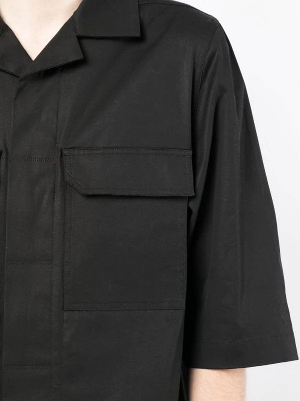 Noir, coton, col cubain, fermeture dissimulée sur le devant, manches mi-longues, ourlet droit, deux poches poitrine à rabat.