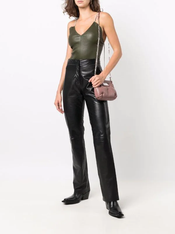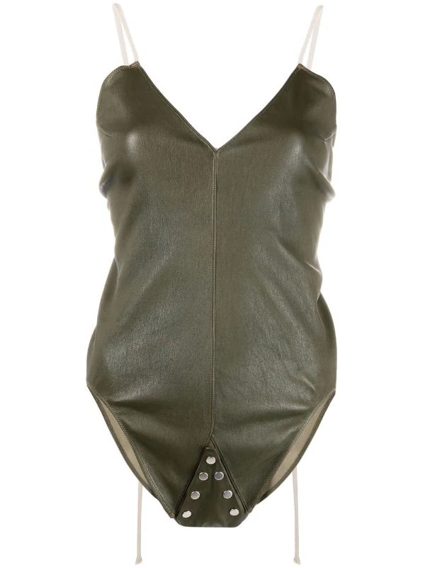 Construction stretch, détail drapé, bretelles fines ajustables, col v, décolleté arrondi dans le dos, fermeture boutonnée. Couleur : vert. Matière : peau d’agneau.