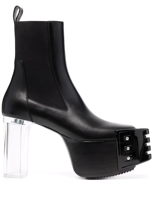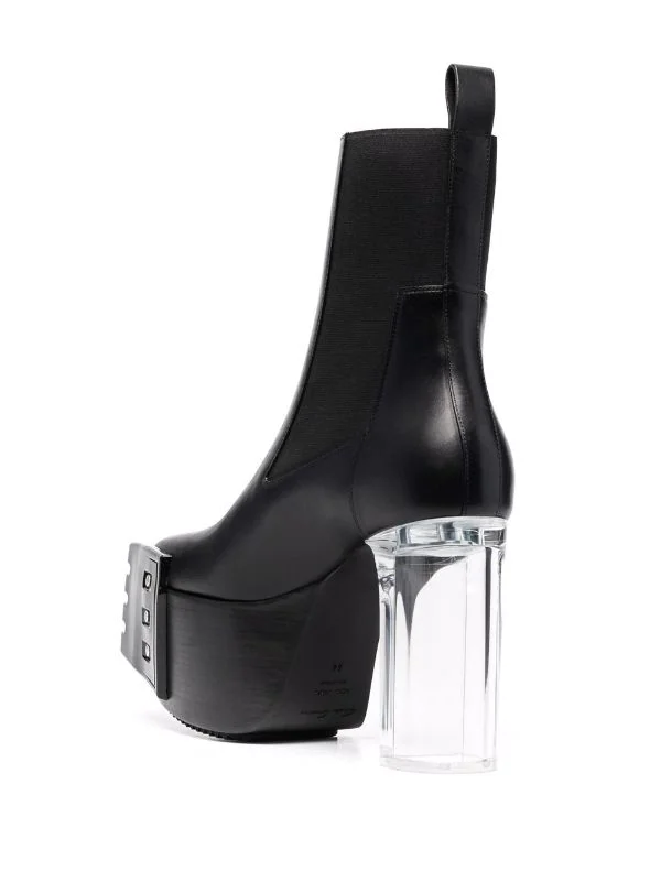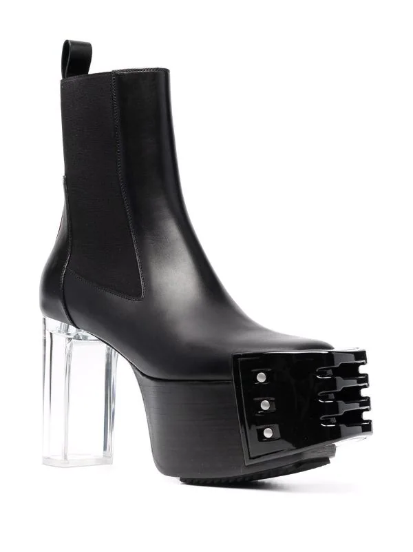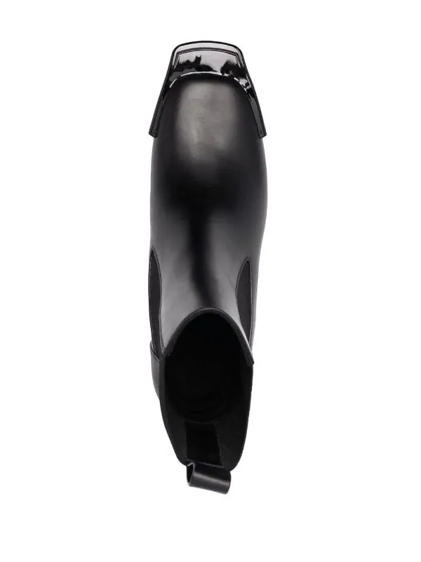 Languette d’enfilage au talon, bout carré, empiècements élastiqués sur les côtés, hauteur cheville, semelle à plateforme, talon haut épais. Couleur : noir. Matière : cuir.