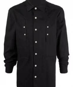 Col classique, boutonnière sur le devant, deux poches poitrine passepoilées, manches longues, poignets boutonnés, ourlet droit. Couleur : noir. Matière : coton.