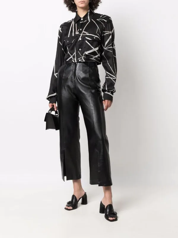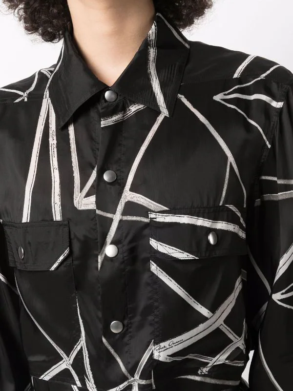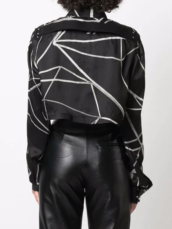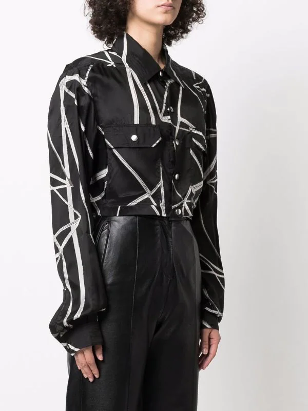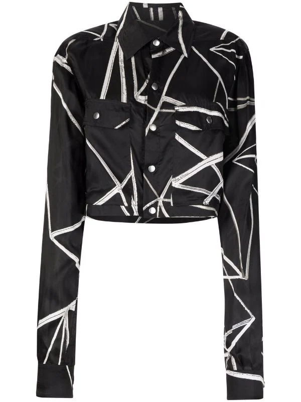 Imprimé abstrait, deux poches poitrine plaquées, col classique, boutonnière sur le devant, manches longues, coupe courte. Matière : cupro.