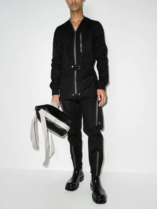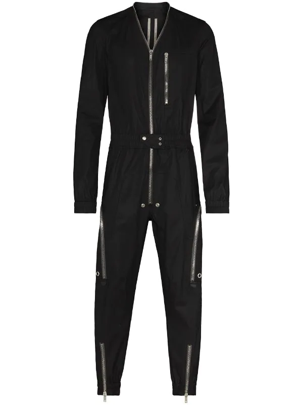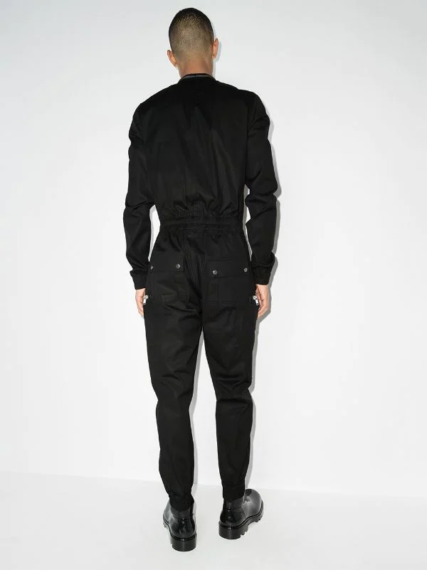 Détails zippés, chevilles zippées, ceinture élastique, col v, fermeture zippée devant, manches longues, poche poitrine zippée, deux poches latérales zippées, poches arrière à rabat. Couleur : noir. Matière : coton.