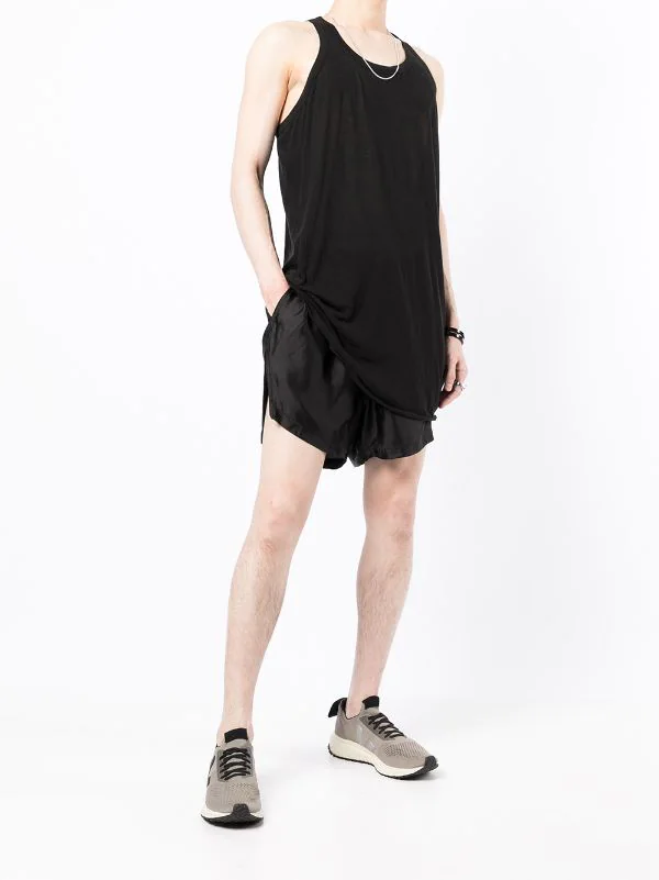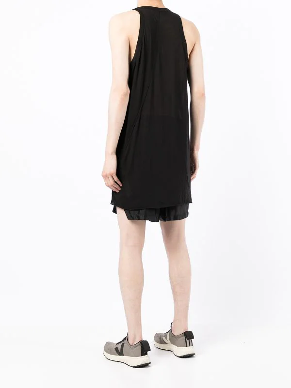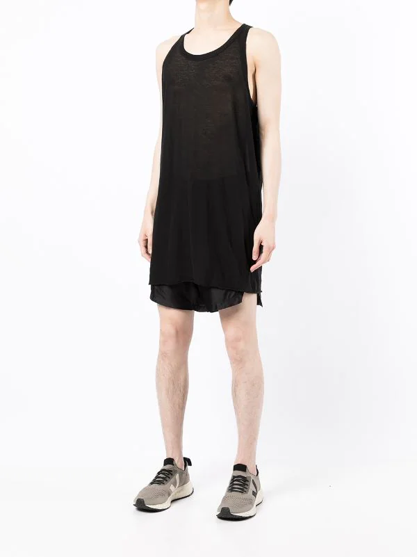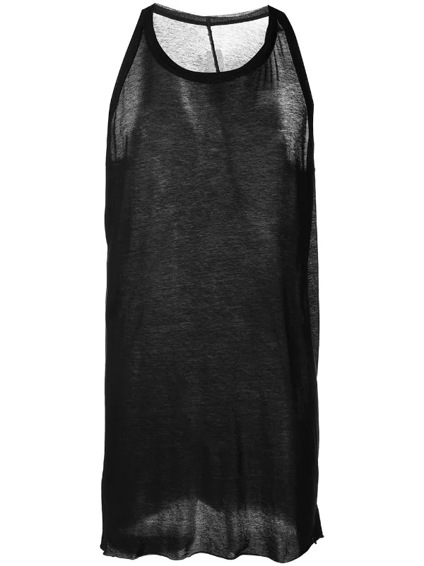 Maille fine, effet chiné, bords francs, coupe longue, encolure ronde, dos nageur, design sans manches, ourlet droit. Couleur : noir. Matière : coton.