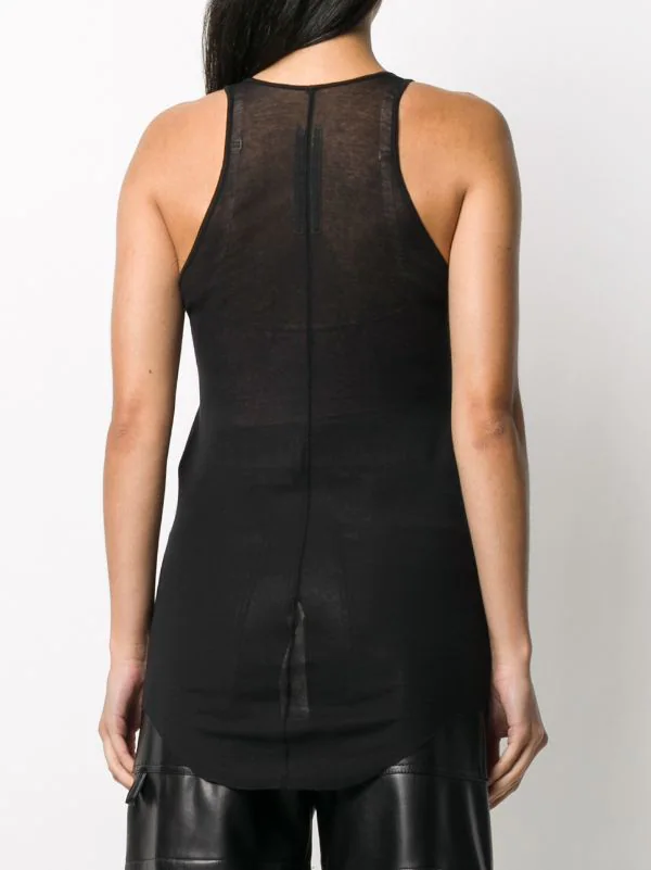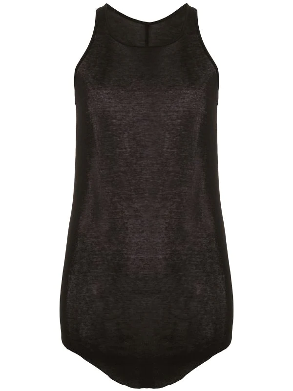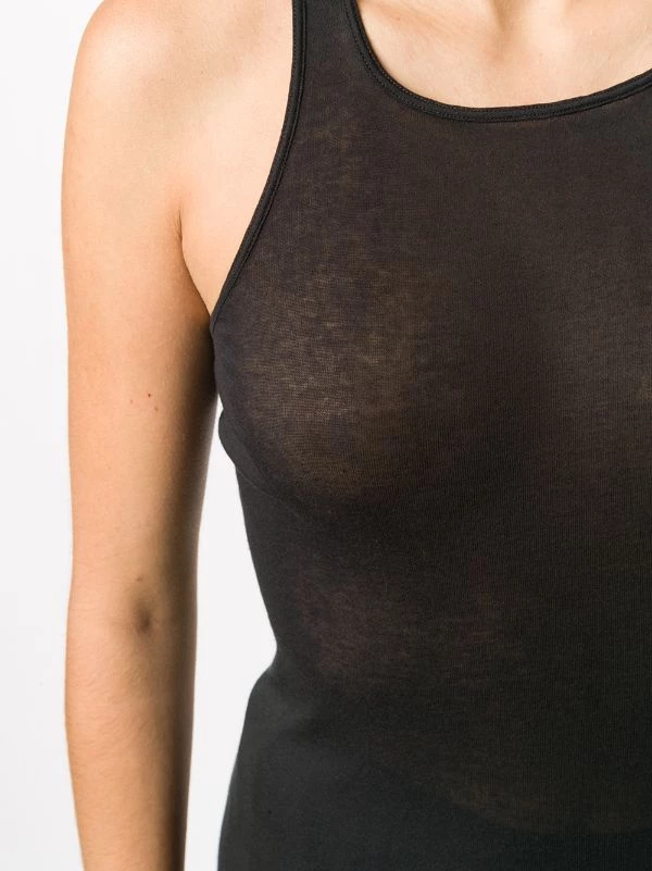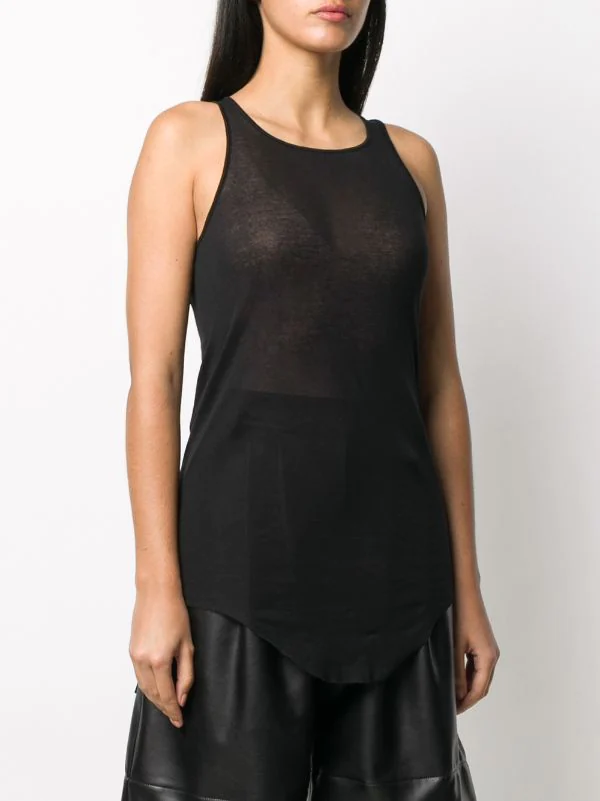 Maille fine, effet de transparence, encolure ronde, design sans manches, ourlet incurvé. Couleur : noir. Matière : coton.