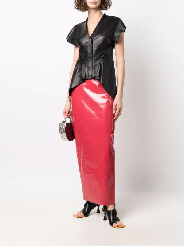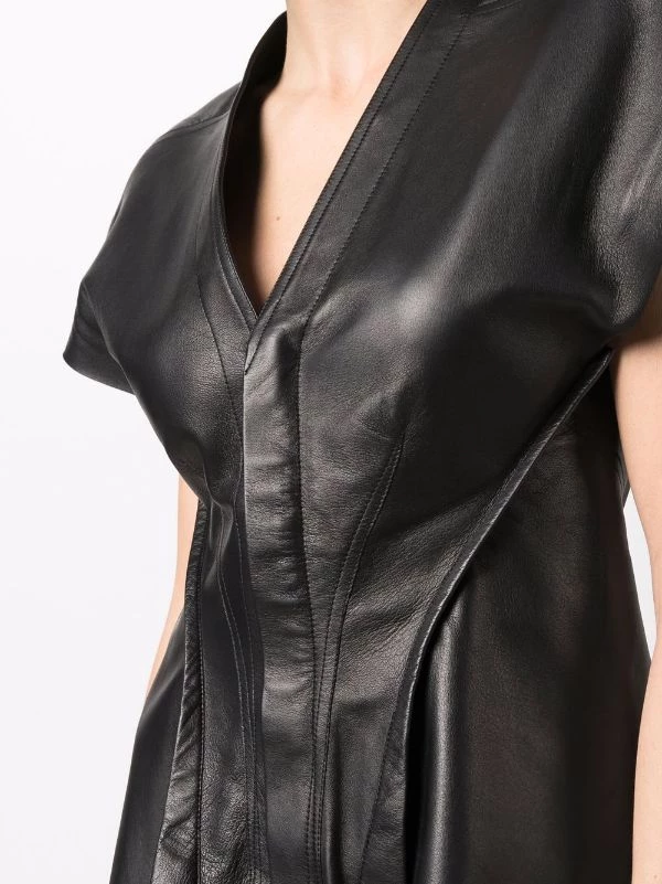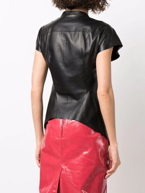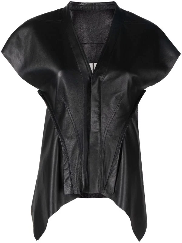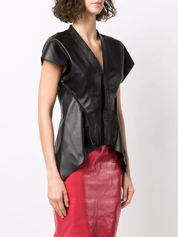 Mancherons, col v, fermeture dissimulée sur le devant, ourlet asymétrique. Couleur : noir. Matière : peau d’agneau.