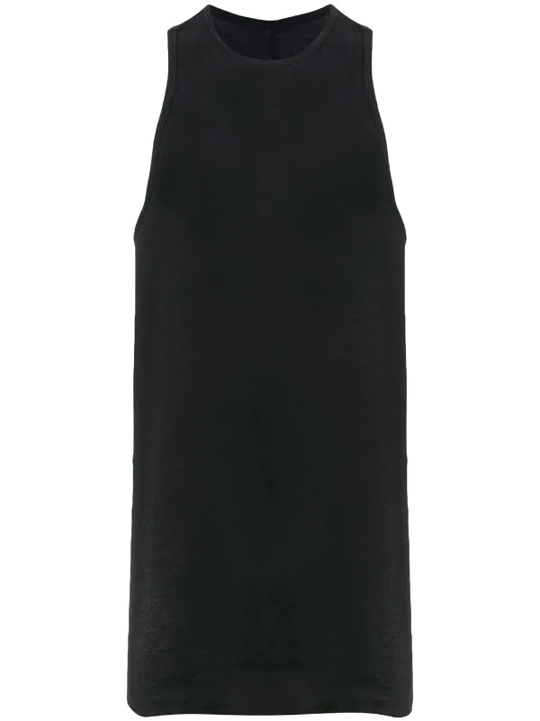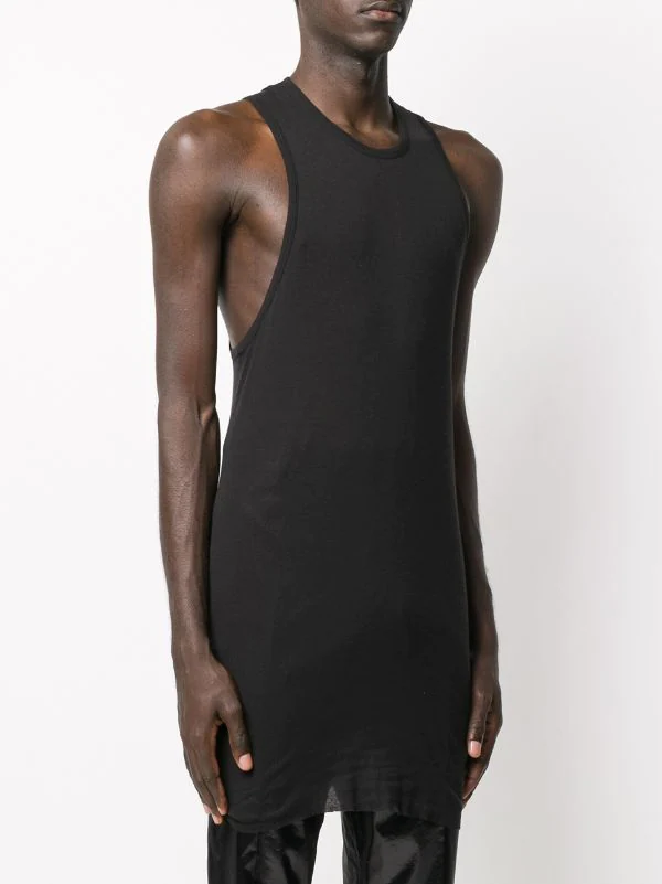 Débardeur slim long en coton Rick Owens avec encolure ronde, grandes emmanchures, a fine knit et ourlet à bord-franc irrégulier. Couleur : noir.