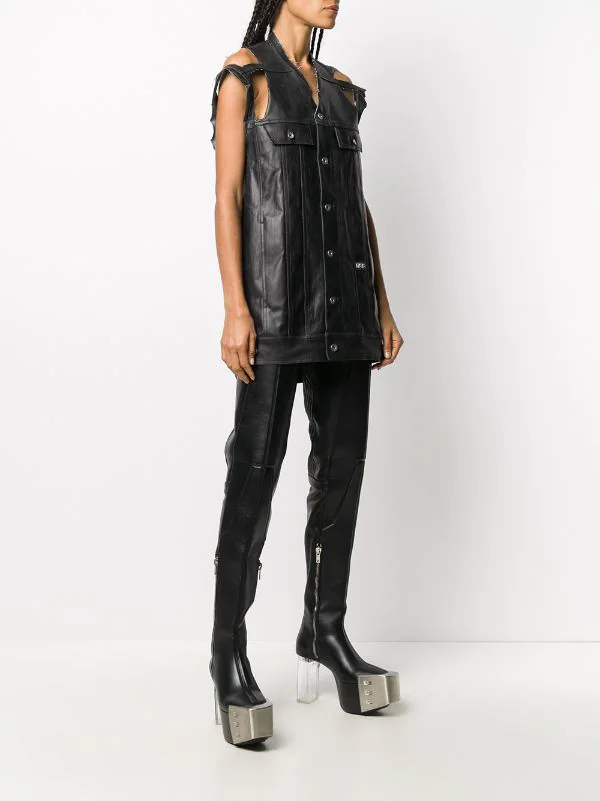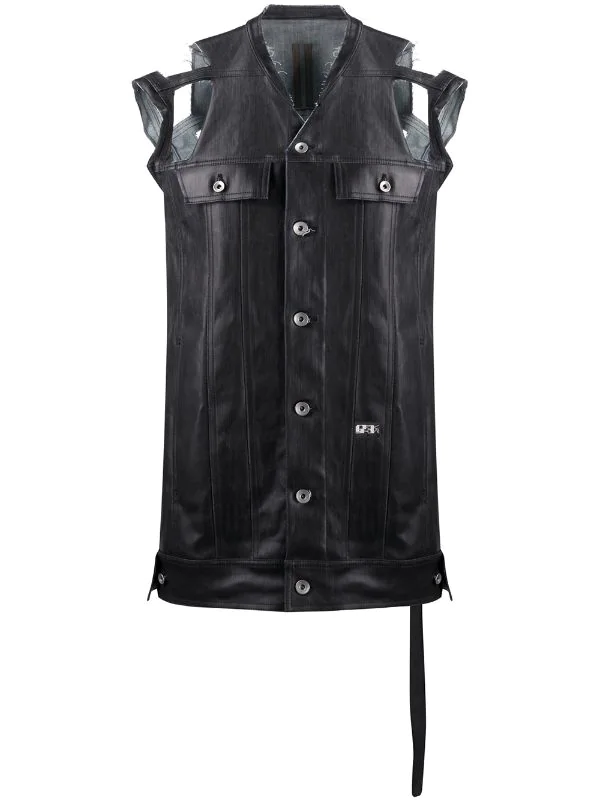 Design à empiècements, détails de découpes, bords francs, col v, design sans manches, patch logo sur le devant, boutonnière sur le devant. Couleur : noir. Matière : coton.