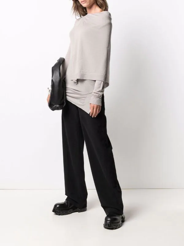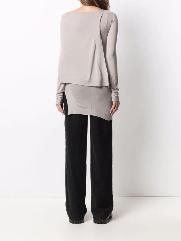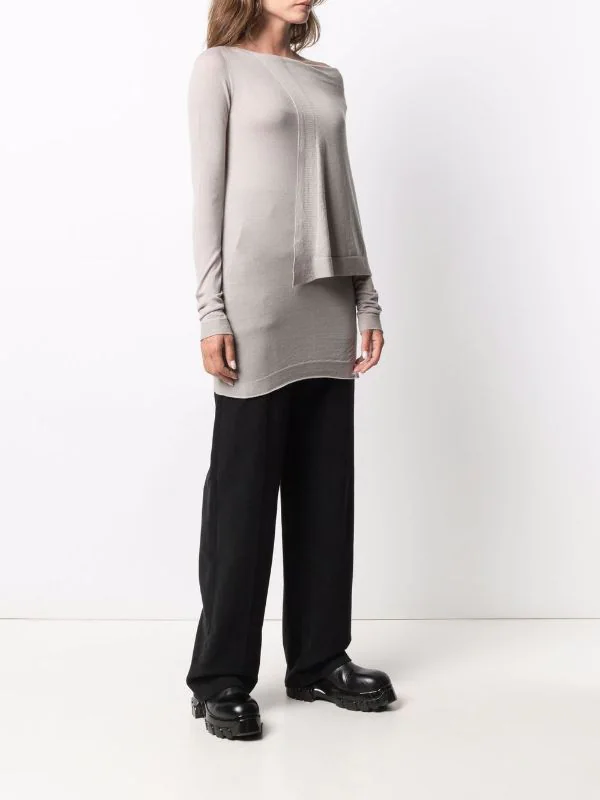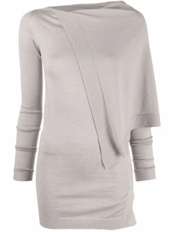 Maille fine, design asymétrique, détails de fronces, manches longues. Matière : laine vierge.