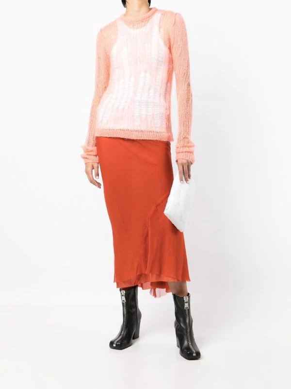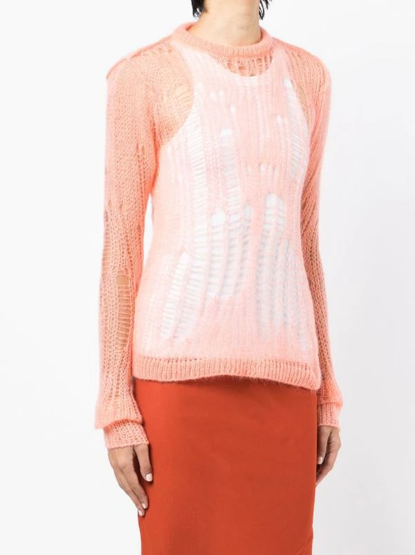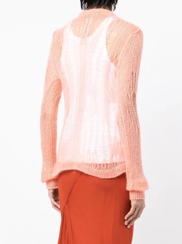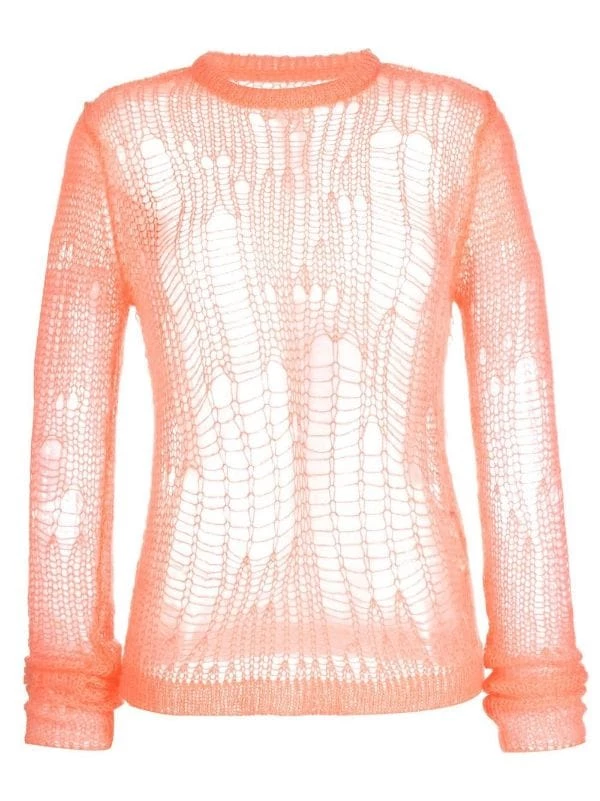 Rose saumon, laine et mohair mélangés, design en maille, couvrance transparente, finitions effilochées, encolure ronde, manches longues, ourlet droit.