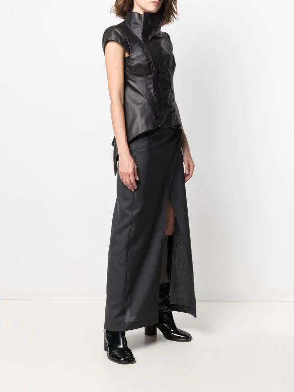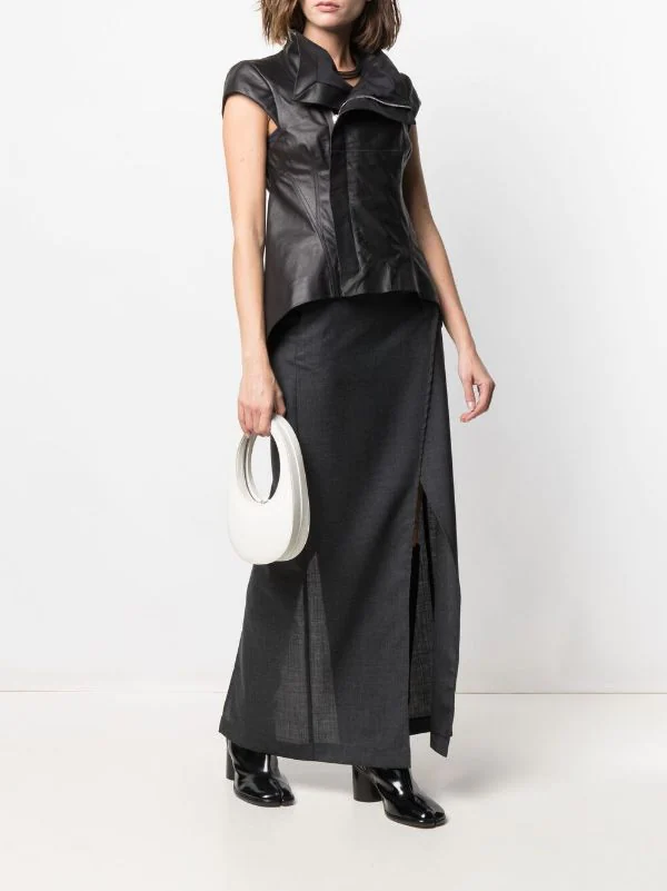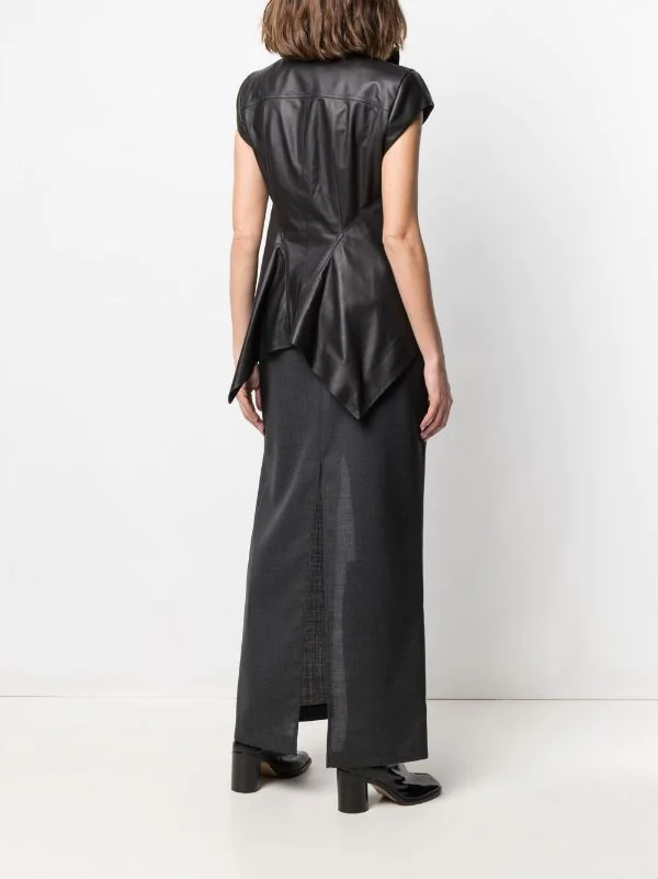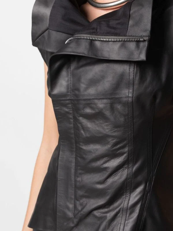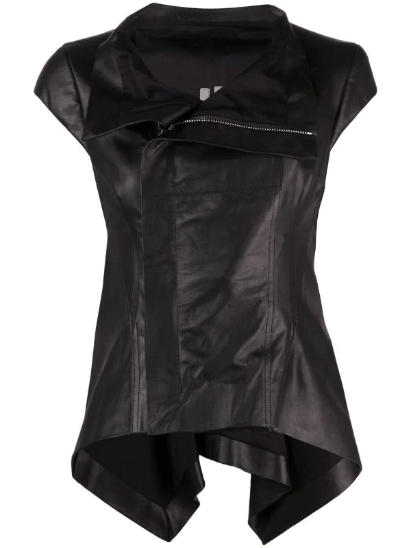 Design asymétrique, coutures ton sur ton, col cassé, fermeture zippée en biais, manches courtes. Couleur : noir.