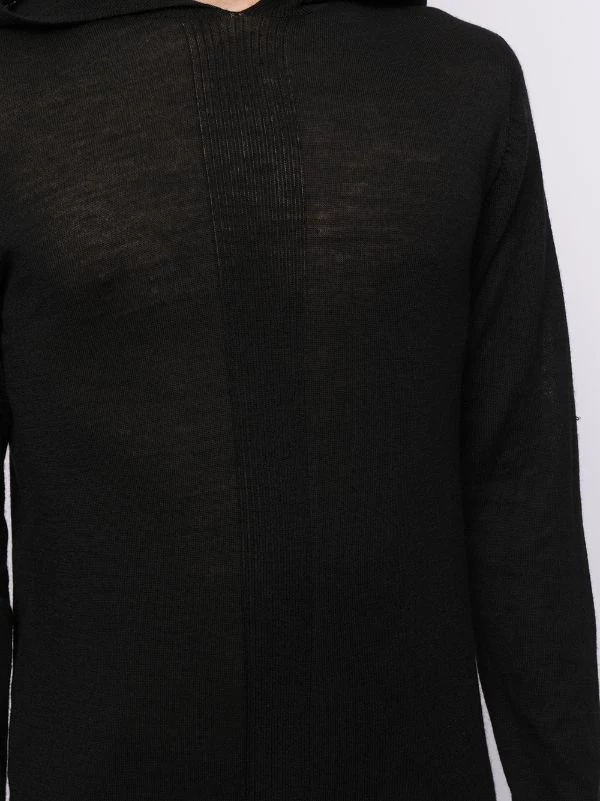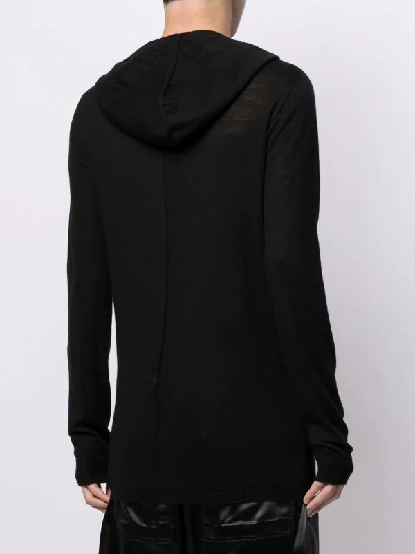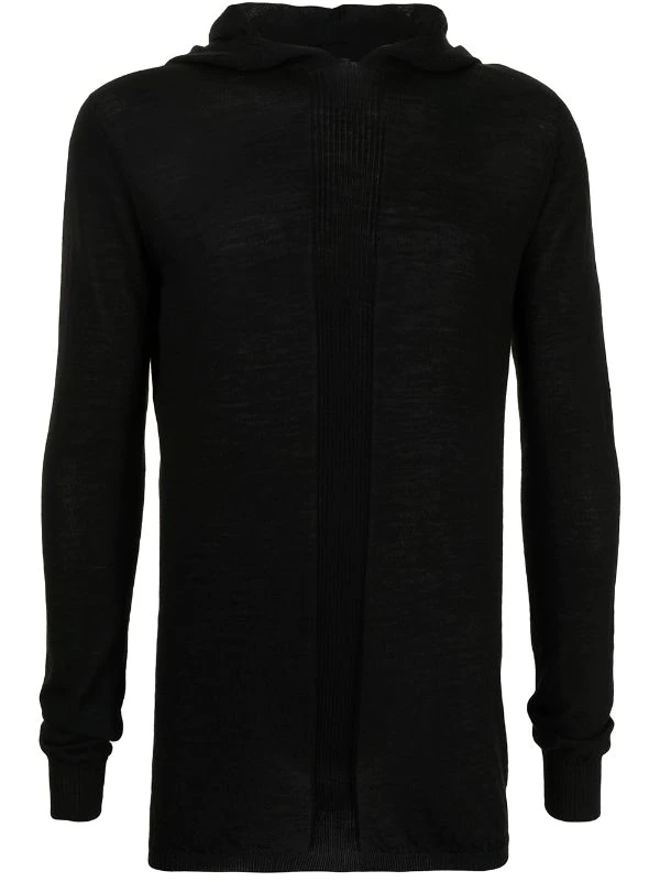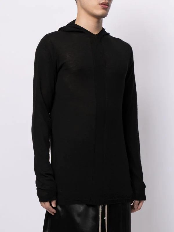 Maille fine, détail nervuré, poignets nervurés, ourlet nervuré, capuche classique, manches longues. Couleur : noir. Matière : laine.