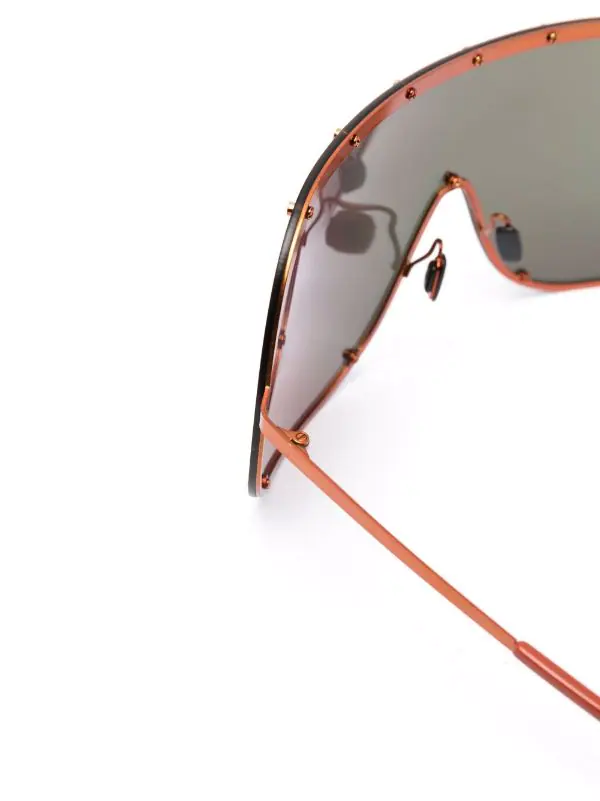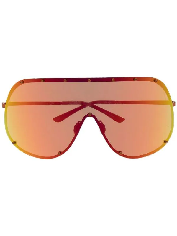 Monture couvrante, verres miroirs, verres filtre UV, plaquettes de nez, branches droites, extrémités incurvées. Couleur : orange. Matière : métal. Ces lunettes sont livrées avec un étui de protection.