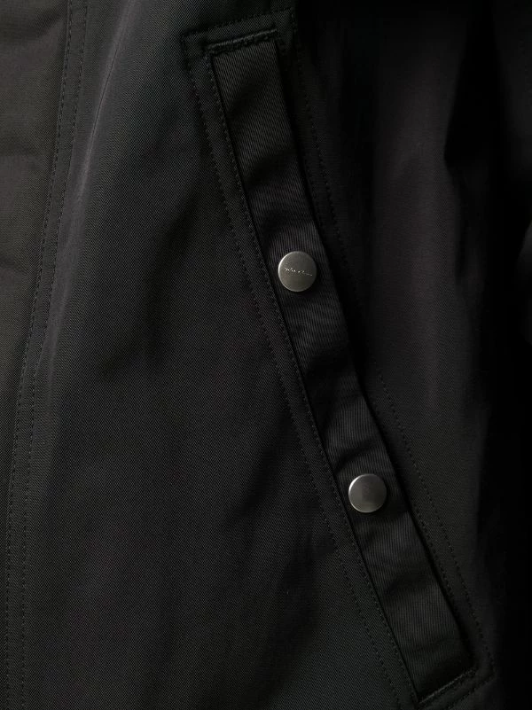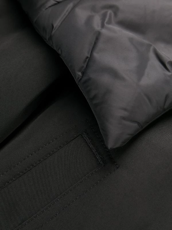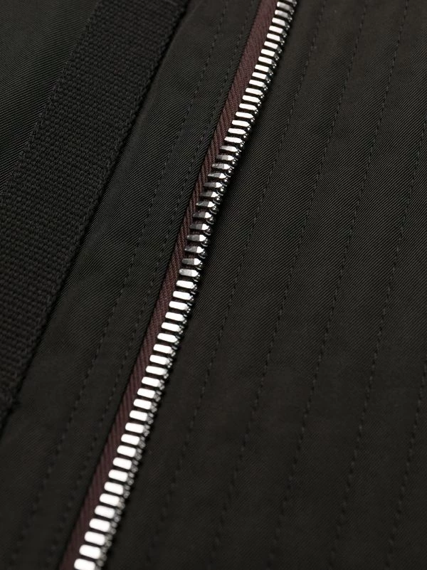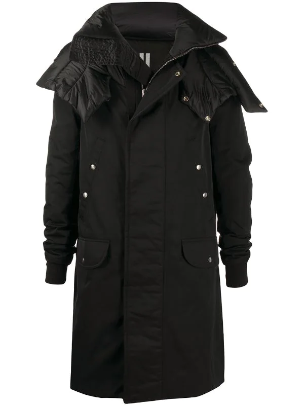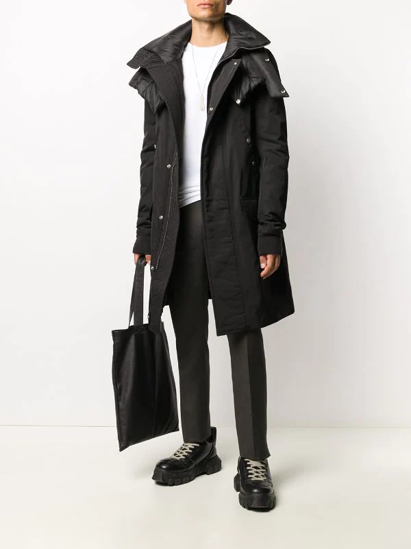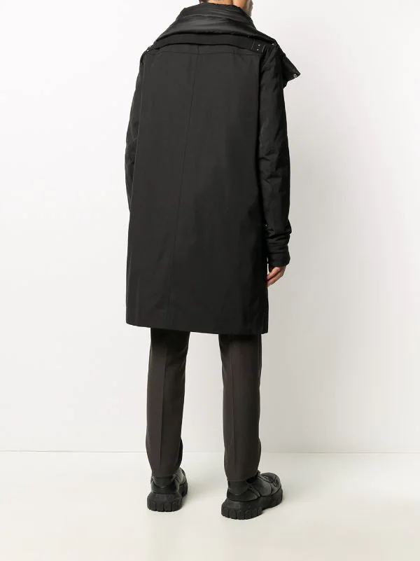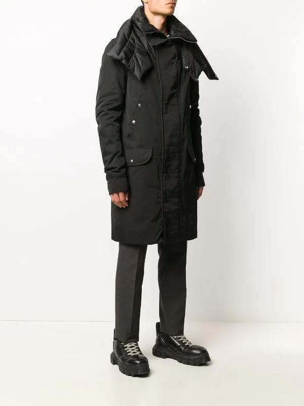Manteau long à col italien en laine vierge Rick Owens avec col italien ouvert, intérieur matelassé, manches longues, fermeture à zip et patte de boutonnage et poches devant à rabat.