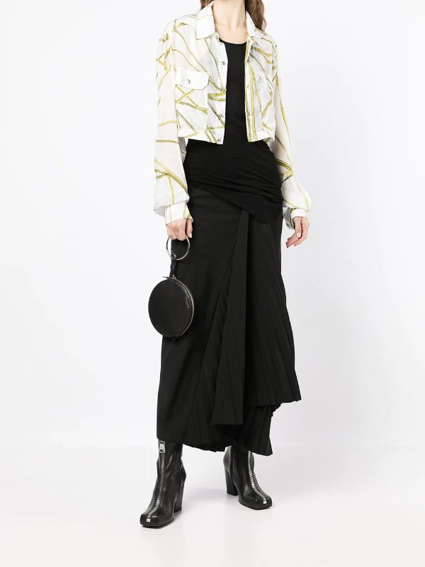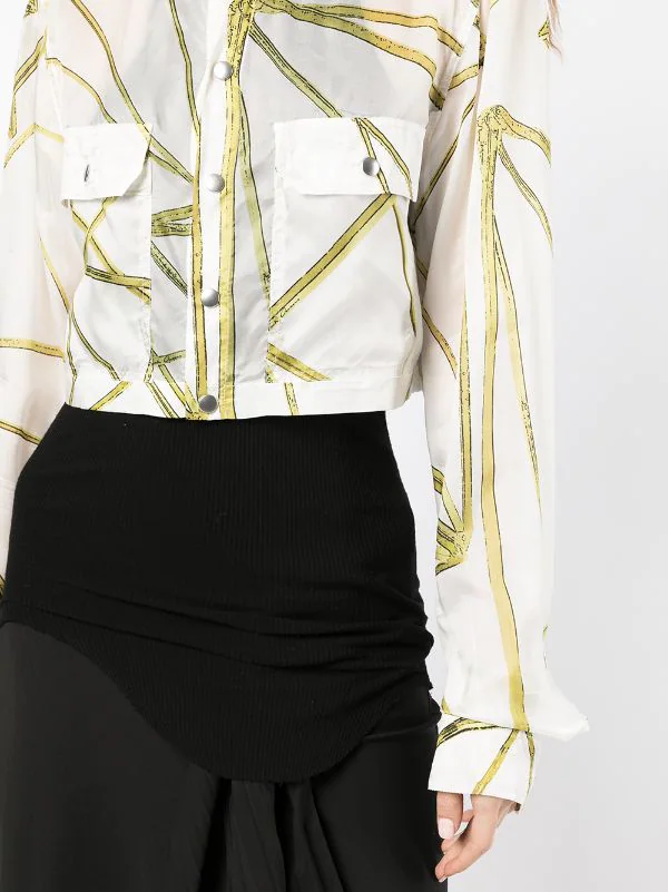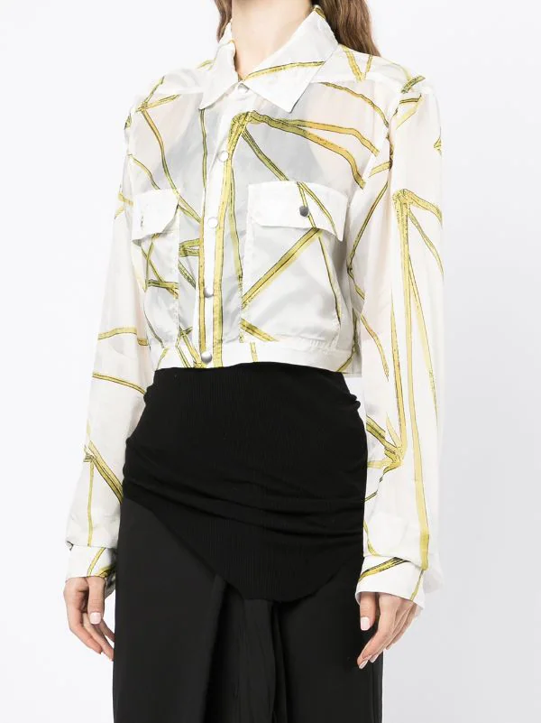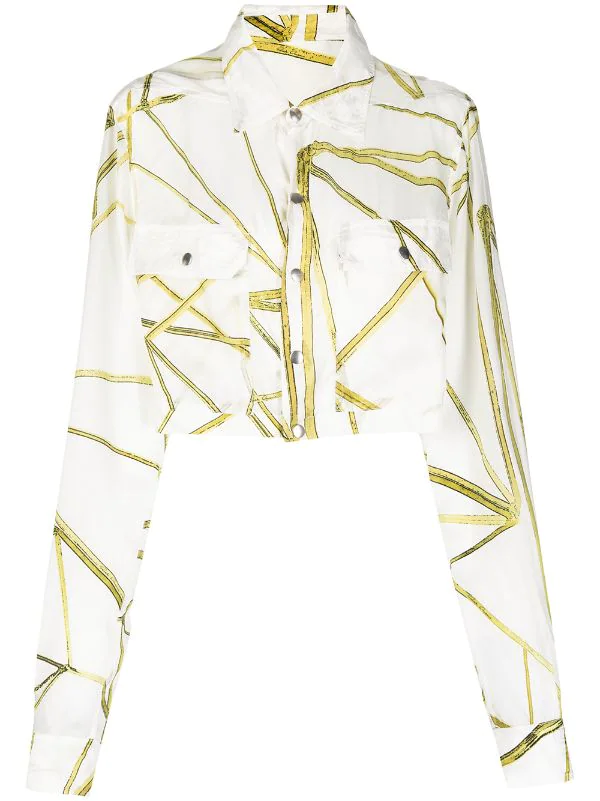 Imprimé graphique intégral, col classique, deux poches poitrine plaquées, manches longues, coupe courte.