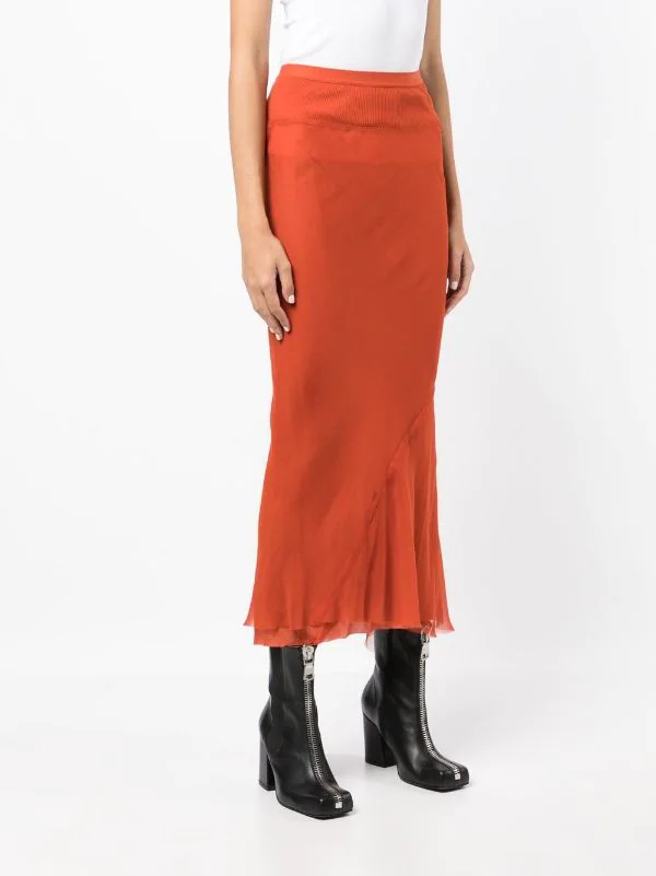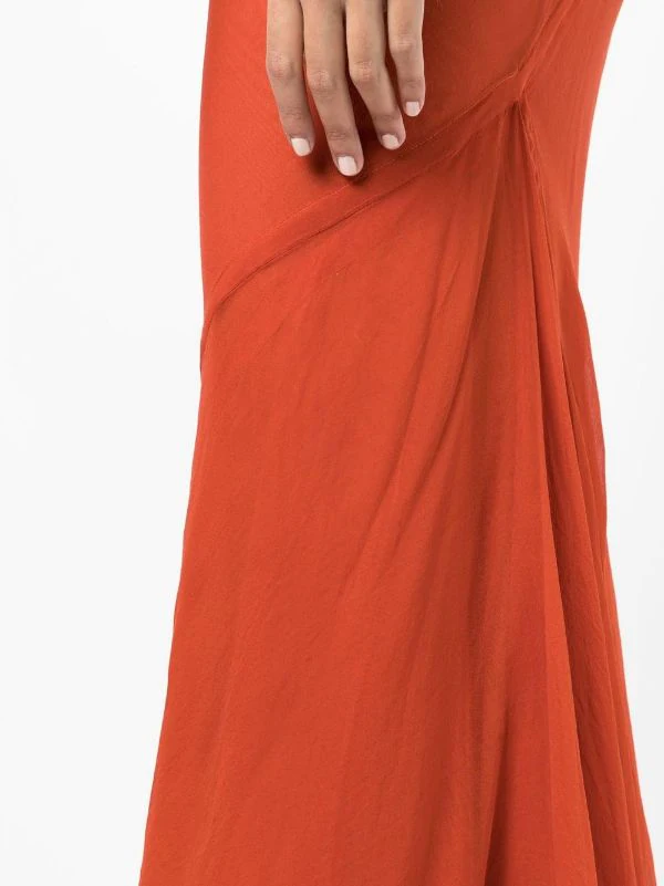 Orange brûlée, soie, détails de fronces, taille haute, ourlet évasé, coupe mi-longue.