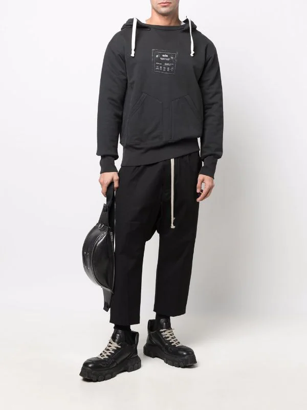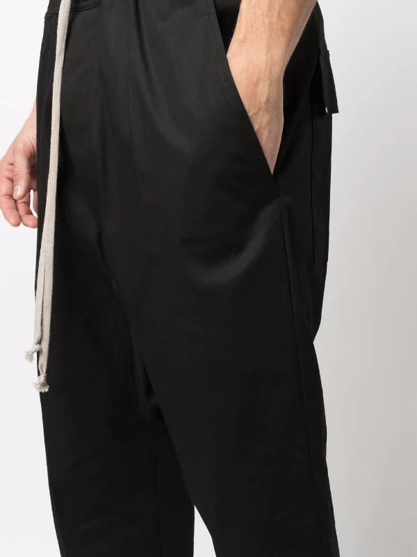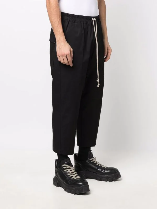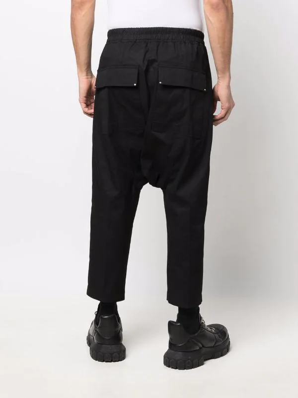Taille élastique à lien de resserrage, poches latérales fendues, poches arrière à rabat, coupe droite, coupe courte. Couleur : noir.