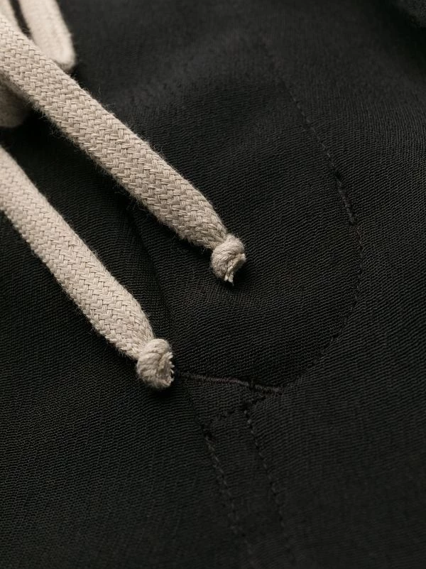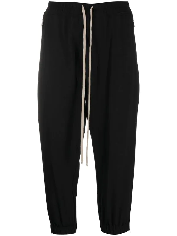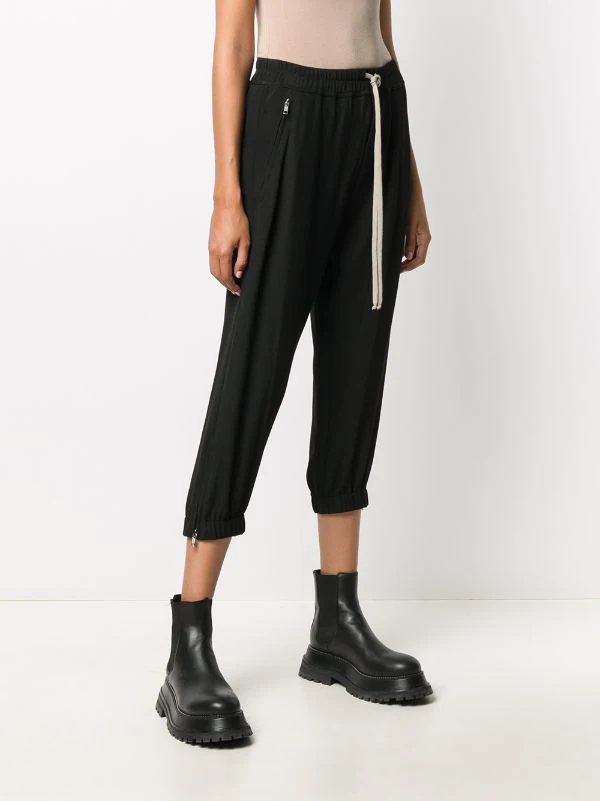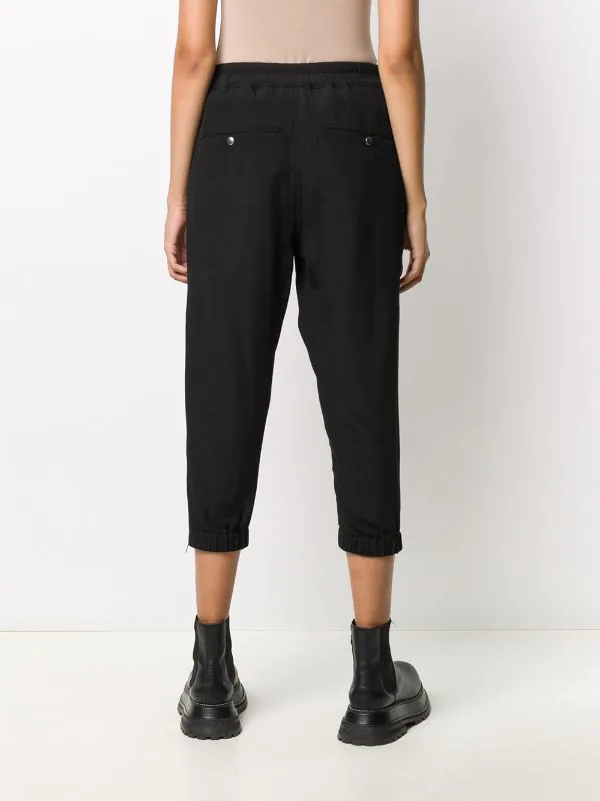 Longueur crop, poignets zippés, deux poches latérales zippées, poches arrière passepoilées, ceinture élastique, lien de resserrage à la taille. Couleur : noir.