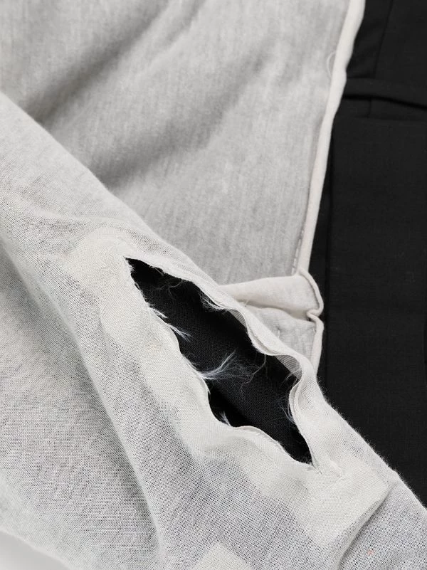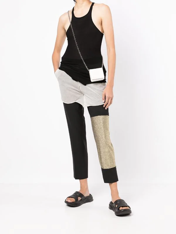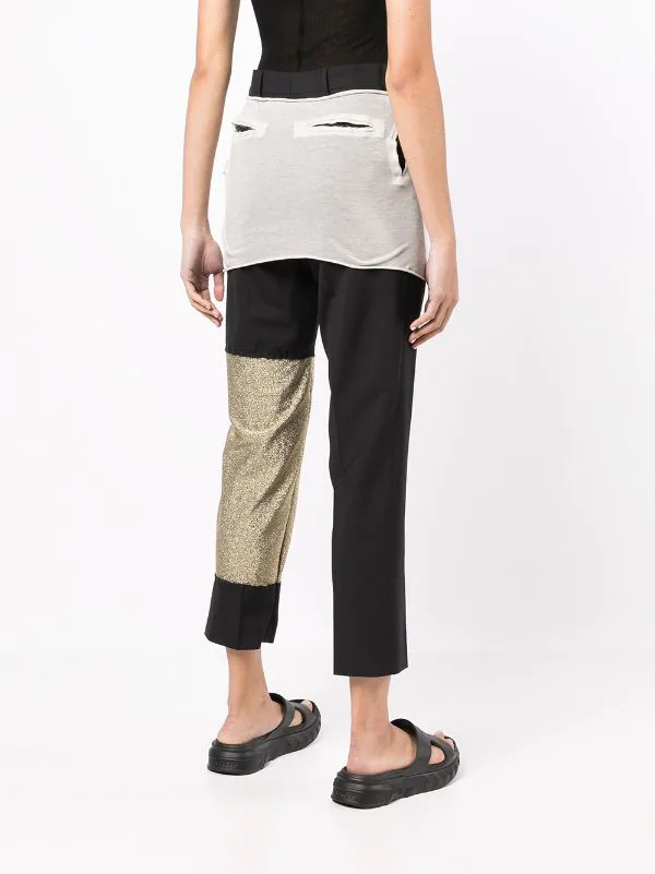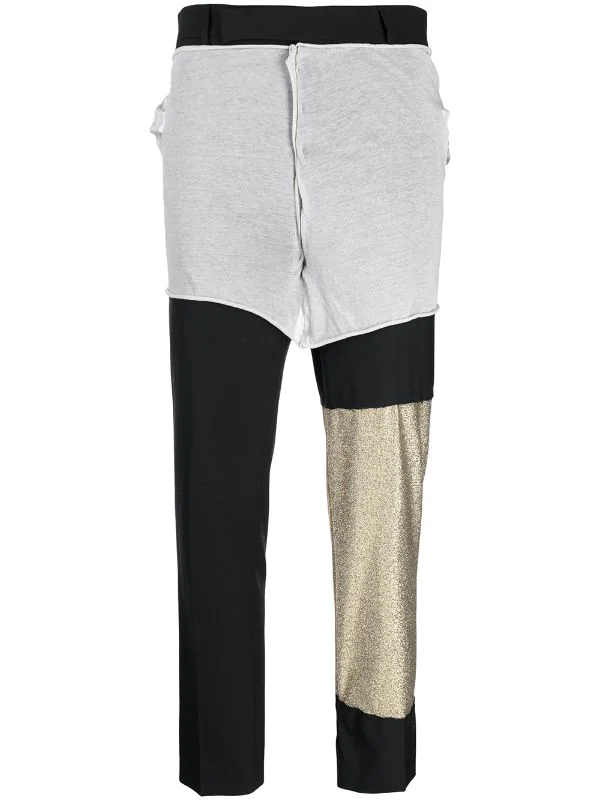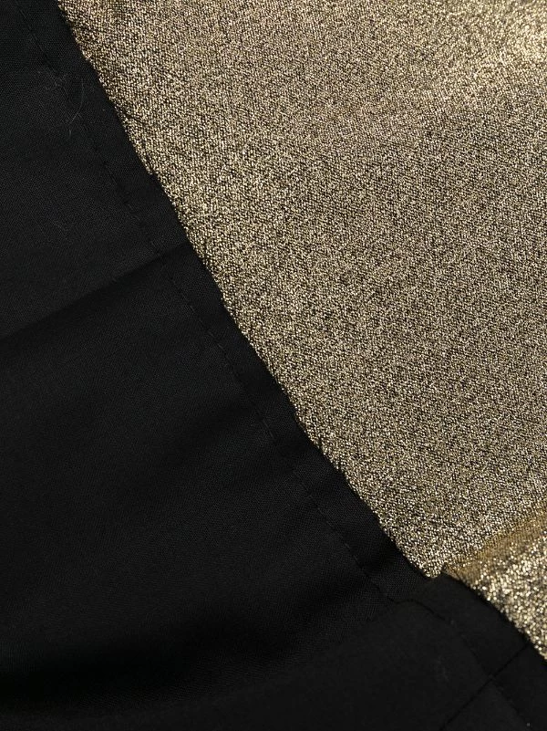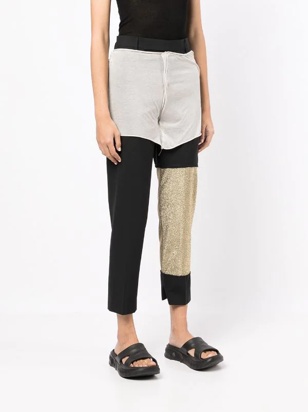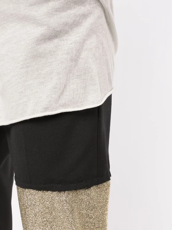 Design à empiècements colour block, détail pailleté, finitions effilochées, ceinture élastique, poches latérales fendues, coupe droite.