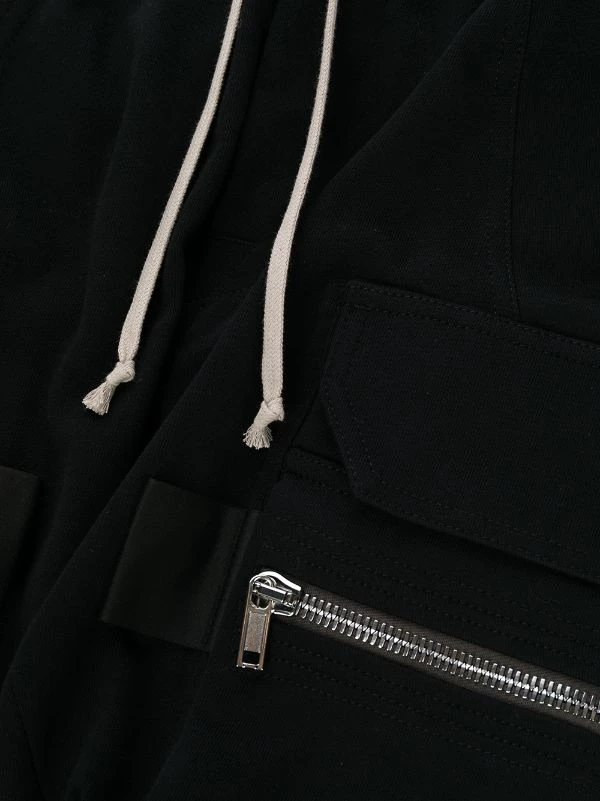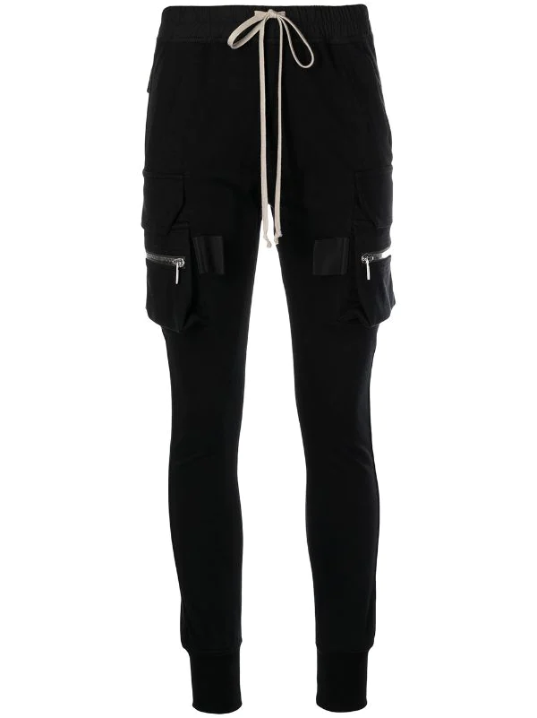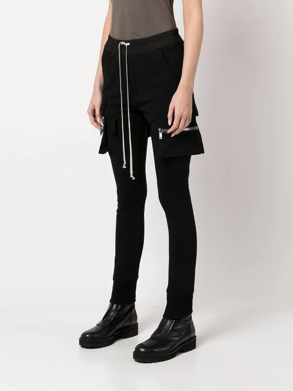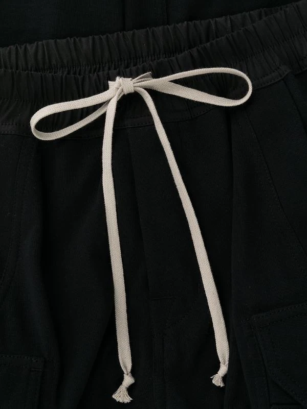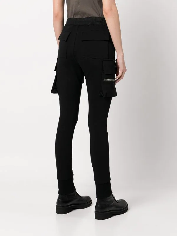 Taille haute, lien de resserrage à la taille, deux poches latérales fendues, poches latérales cargo, poches arrière à rabat, coupe skinny. Couleur : noir. Matière : coton.