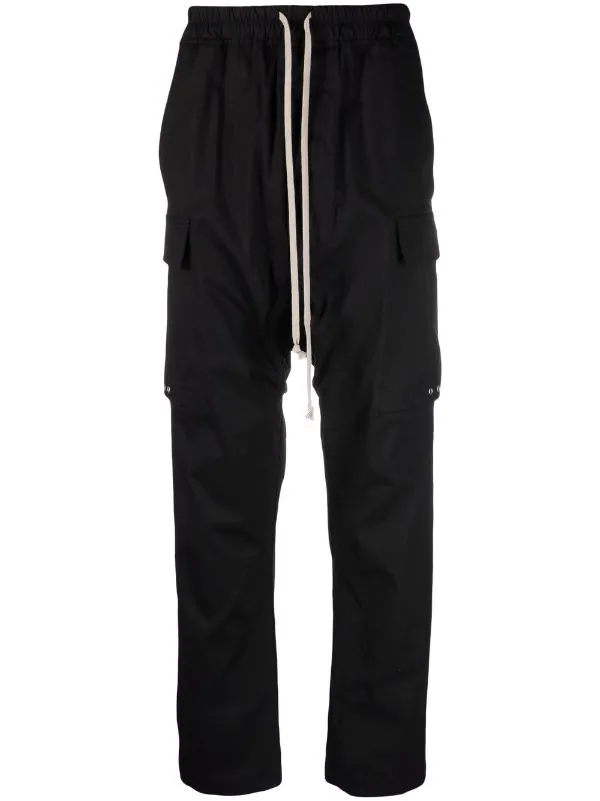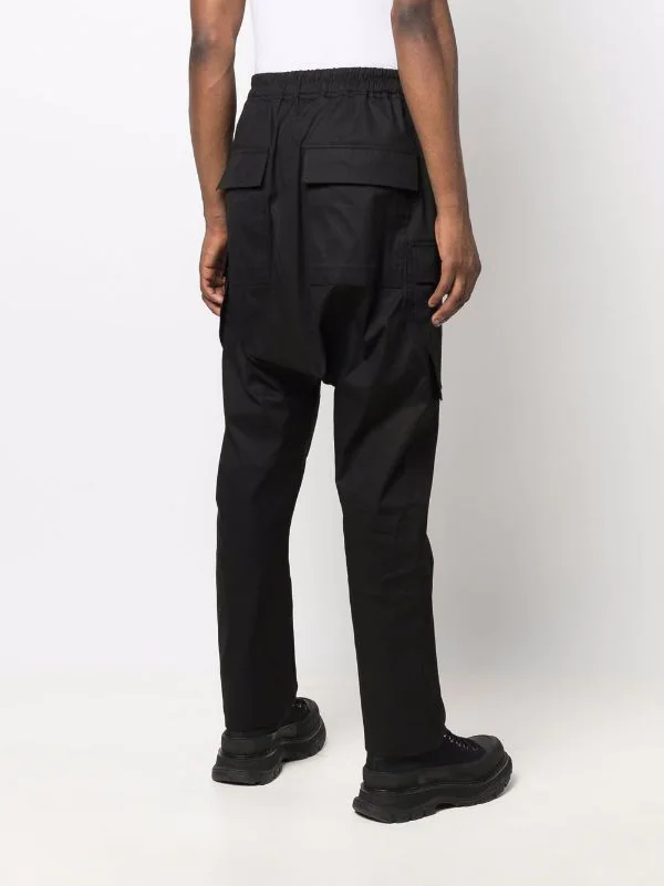 Taille élastique à lien de resserrage, entrejambe sarouel, deux poches latérales fendues, poches latérales cargo, poches arrière à rabat. Couleur : noir.