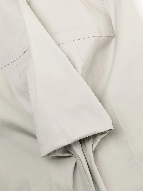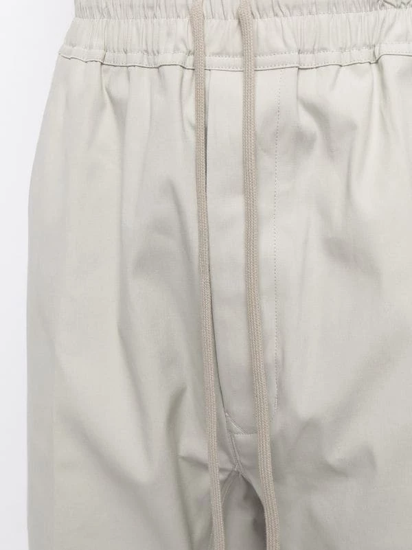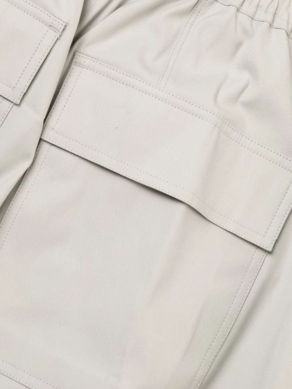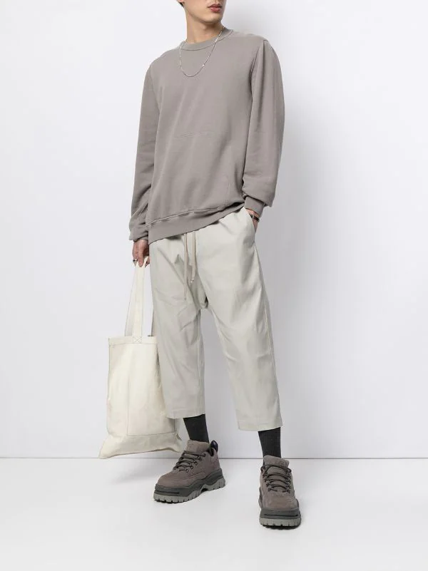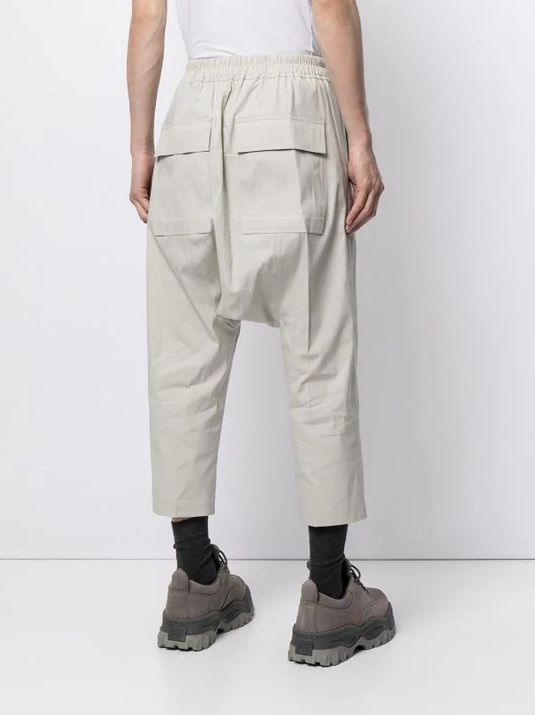 Construction stretch, plis marqués, taille élastique à lien de resserrage, poches latérales fendues, effet sarouel, poches arrière à rabat, longueur crop. Couleur : gris.