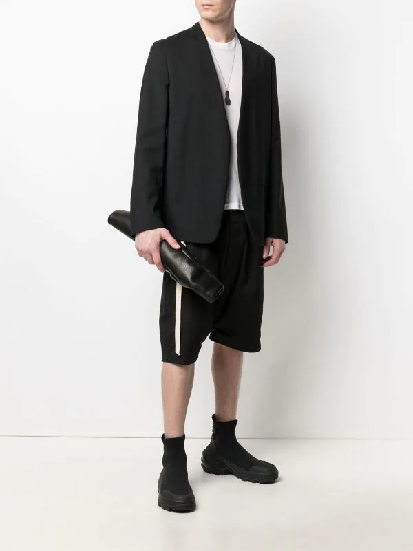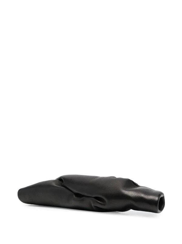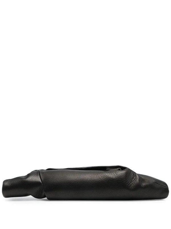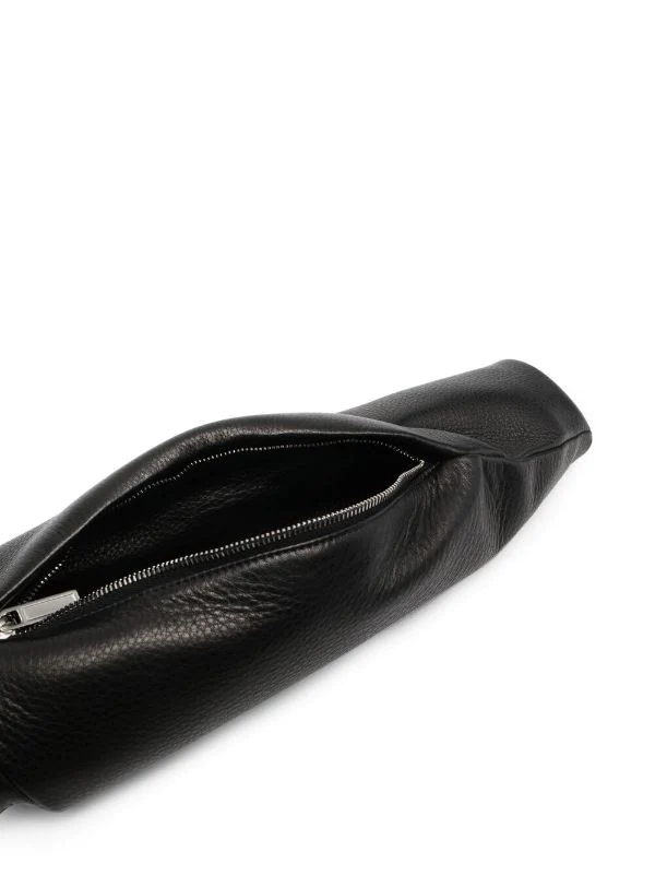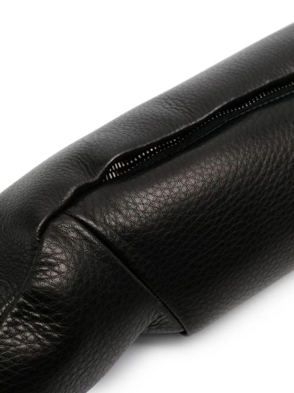 Texture grainée, fermeture zippée sur le dessus, compartiment principal. Couleur : noir. Matière : cuir de veau.
