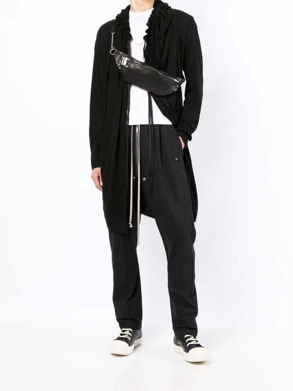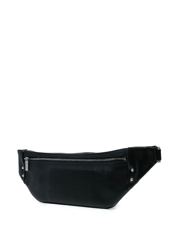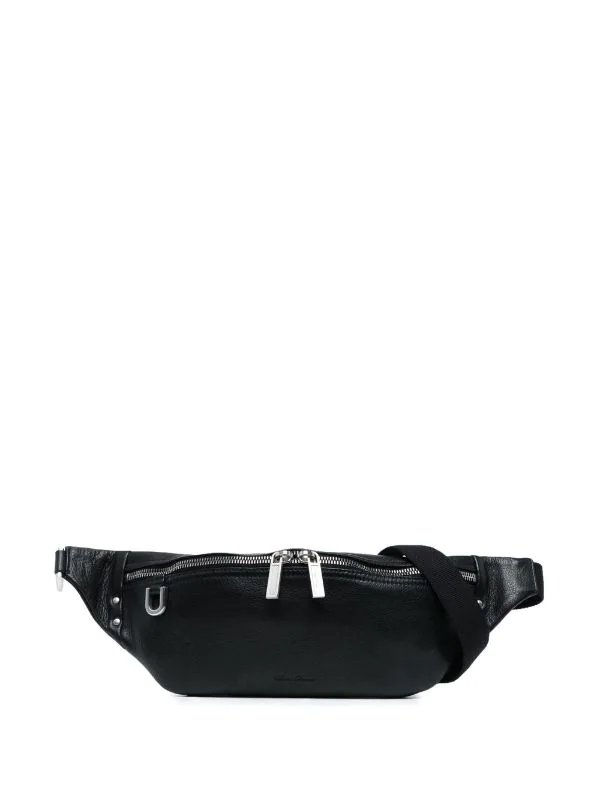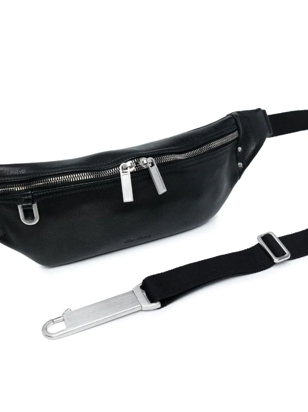 Noir, cuir, finitions en métal argenté, logo embossé sur le devant, fermeture zippée à double sens sur le devant, ceinture ajustable et détachable, compartiment principal.