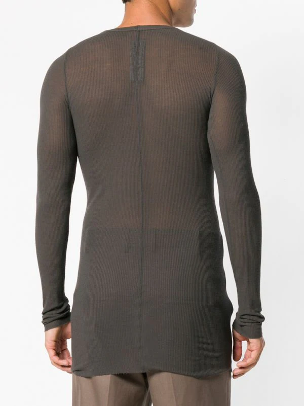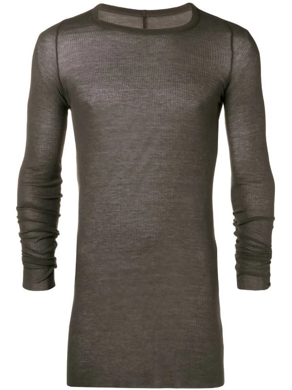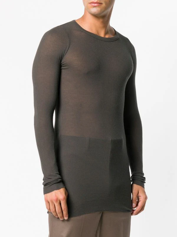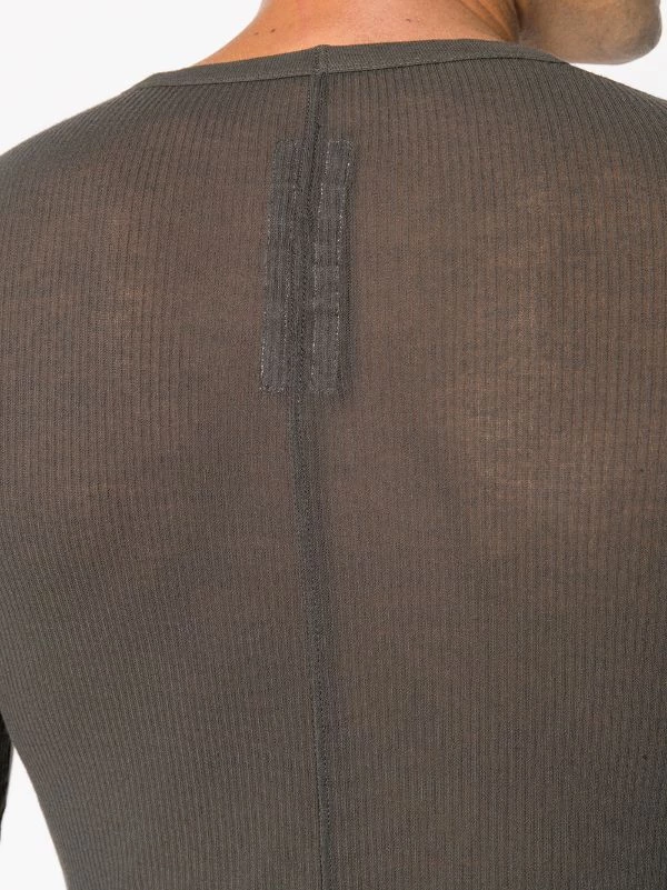 See-through T-shirt Rick Owens avec design transparent, encolure ras du cou nervurée, design nervuré, coupe longue et coupe slim. Couleur : vert.