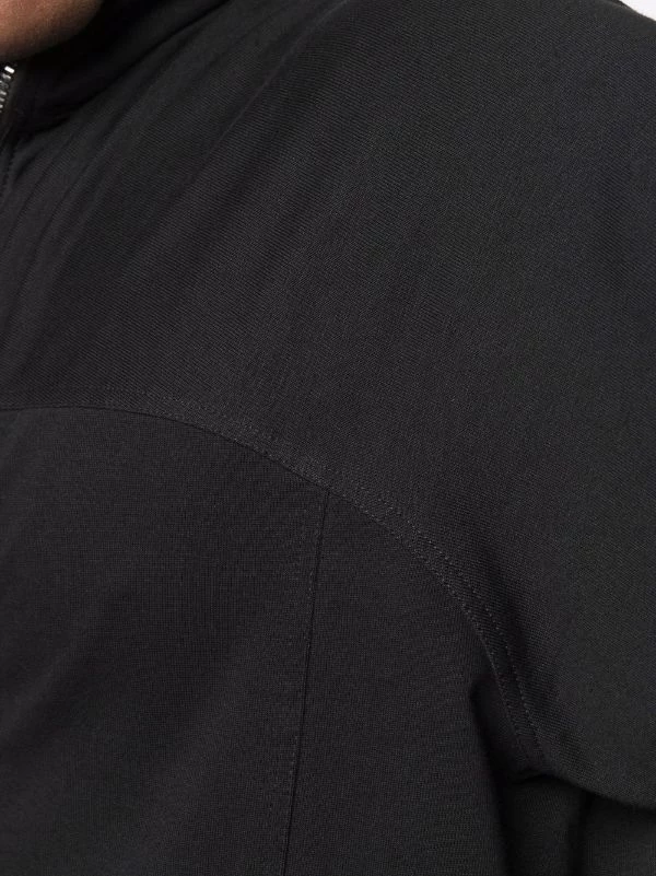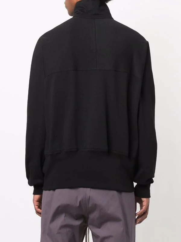 Col montant, fermeture zippée devant, manches longues, deux poches latérales zippées. Couleur : noir. Matière : coton.