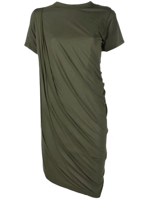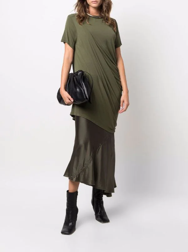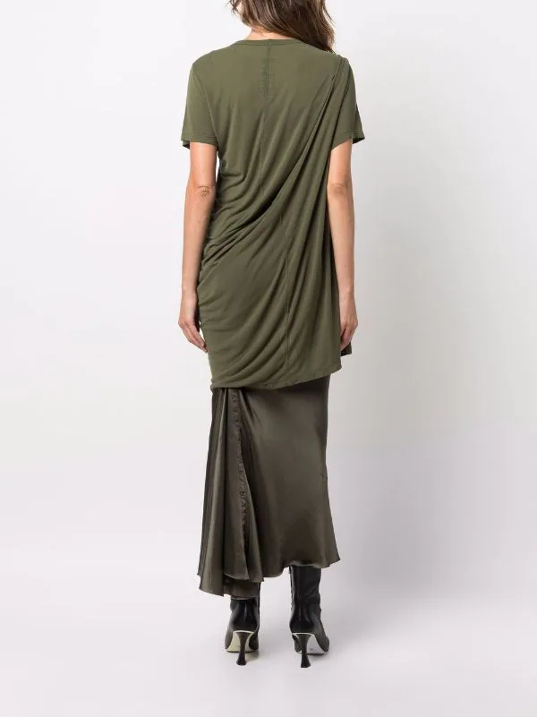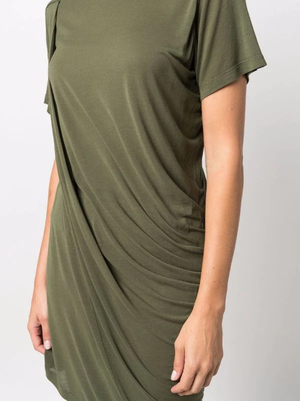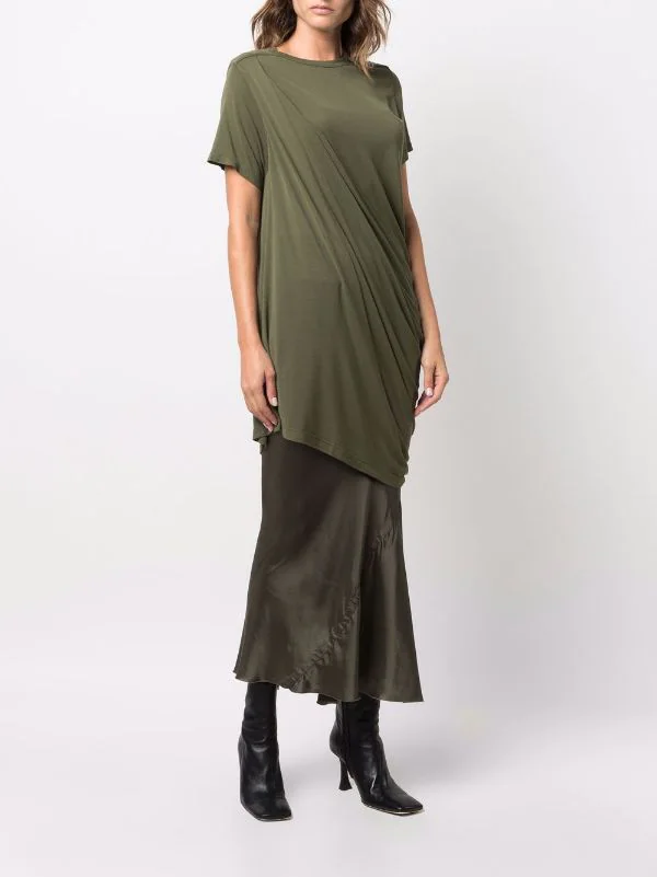 Tricot point jersey, détails de fronces, encolure ronde, manches courtes, ourlet asymétrique, coupe longue. Couleur : vert.