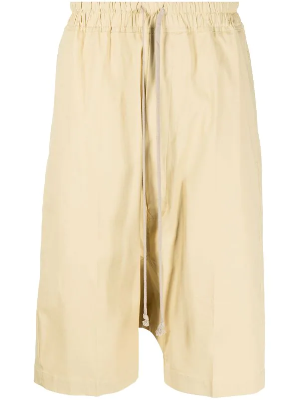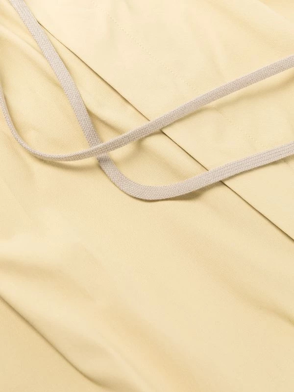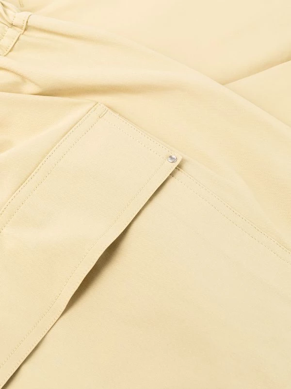 Jaune clair, coton, entrejambe sarouel, taille élastique à lien de resserrage, poches latérales fendues, hauteur genou.