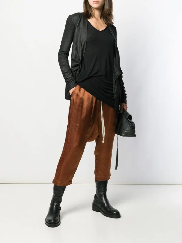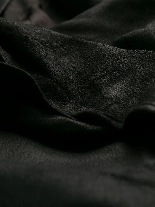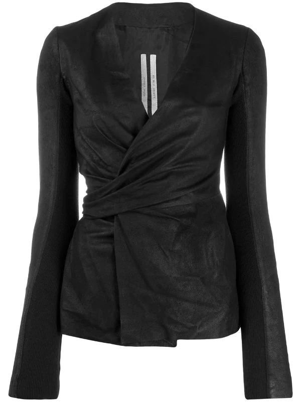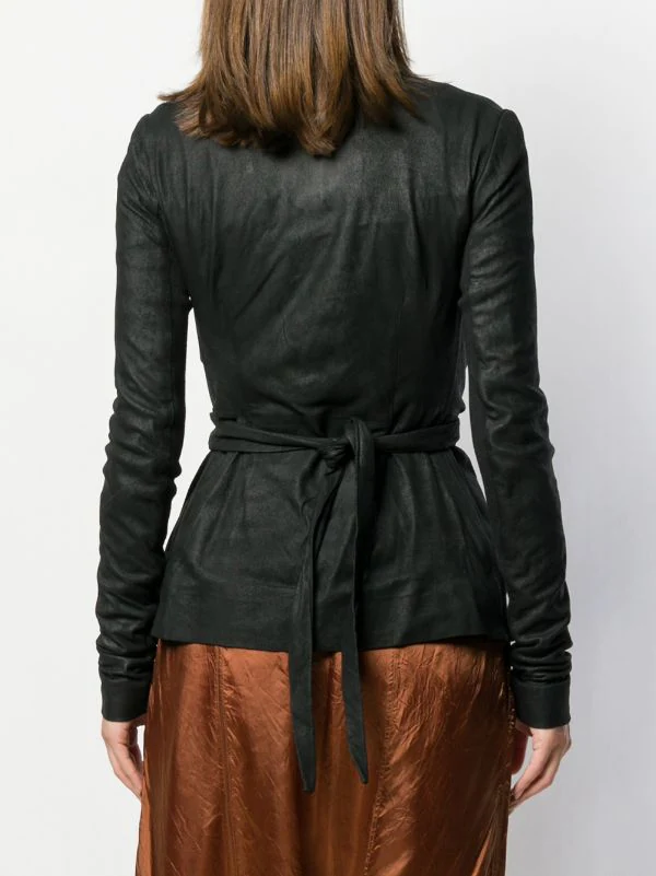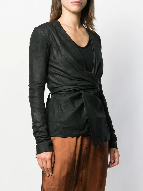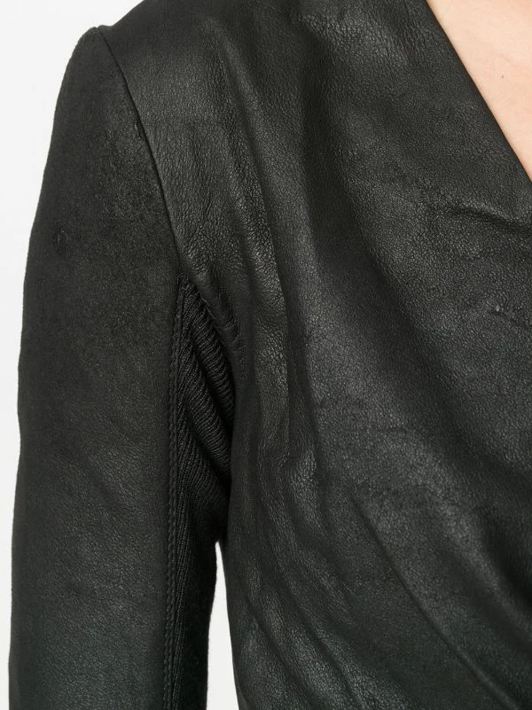 Veste ajustée à effet portefeuille en cuirs Rick Owens avec manches longues, silhouette ajustée, devant à effet portefeuille et fermeture à nouer. Couleur : noir.