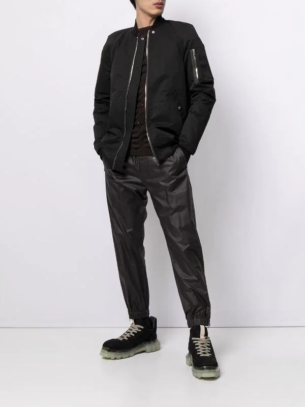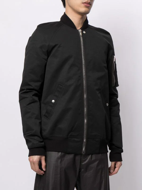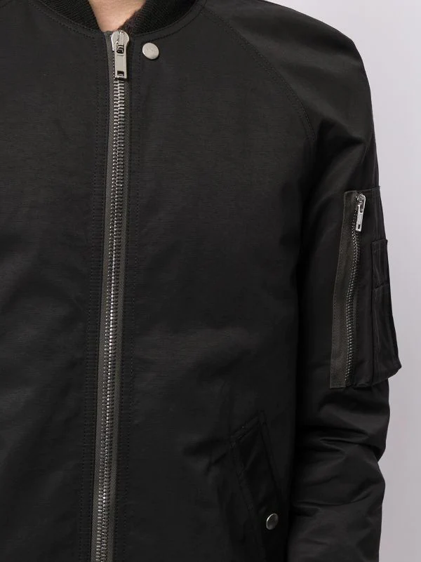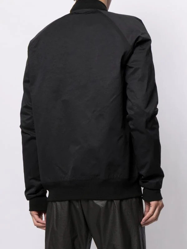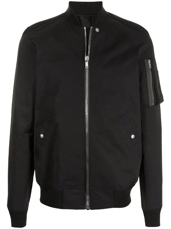 Col montant, fermeture zippée devant, poche zippée sur la manche, manches longues, poches latérales fendues, bordures nervurées. Couleur : noir. Matière : coton.