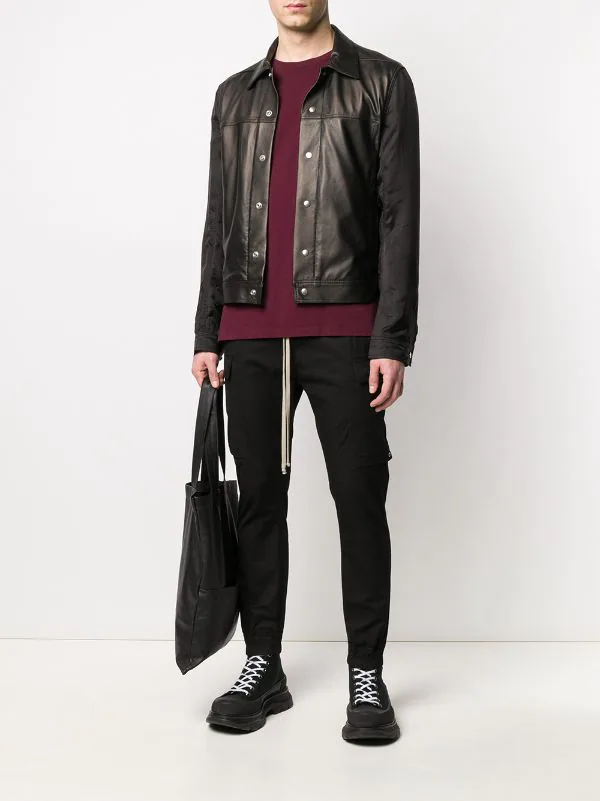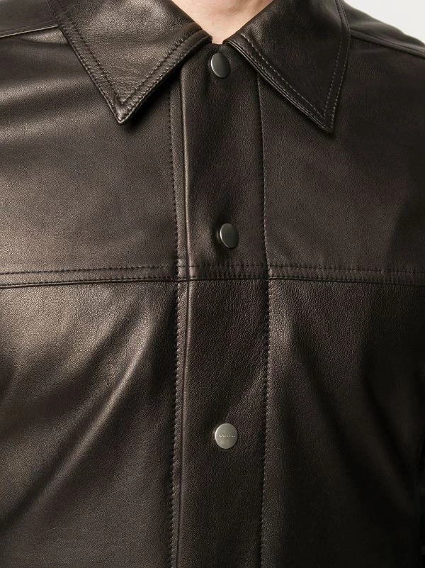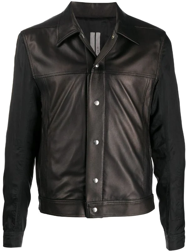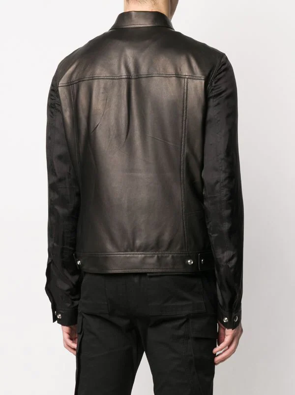 Veste courte en cuir en cuir Rick Owens avec col pointu, boutonnière sur le devant et manches longues. Couleur : noir.