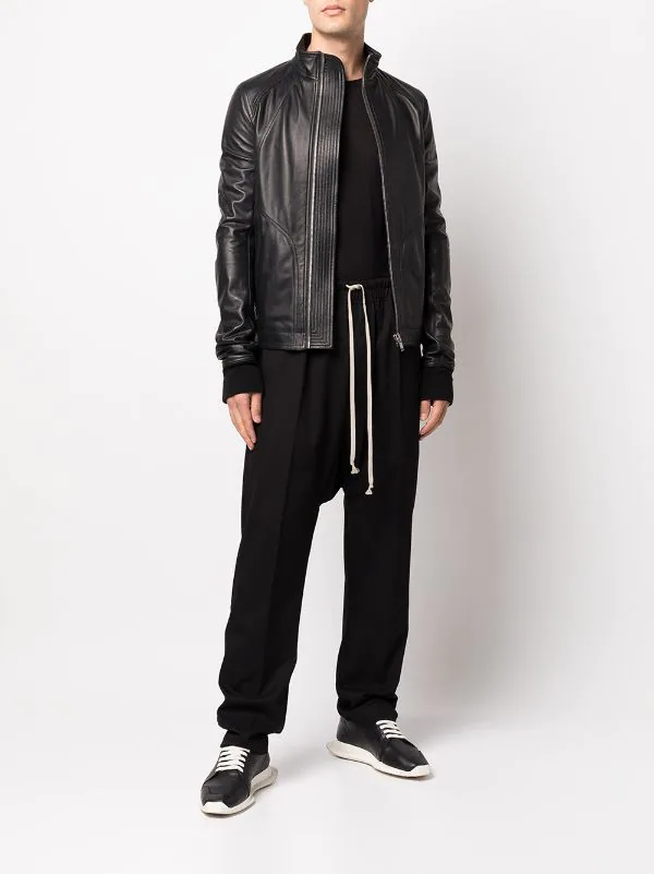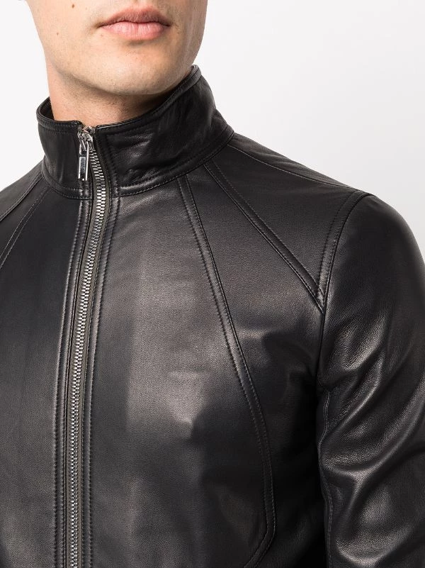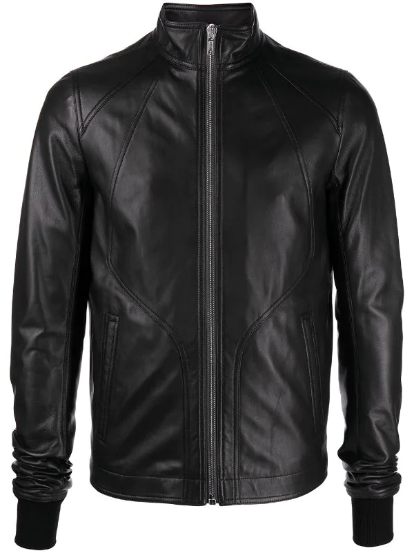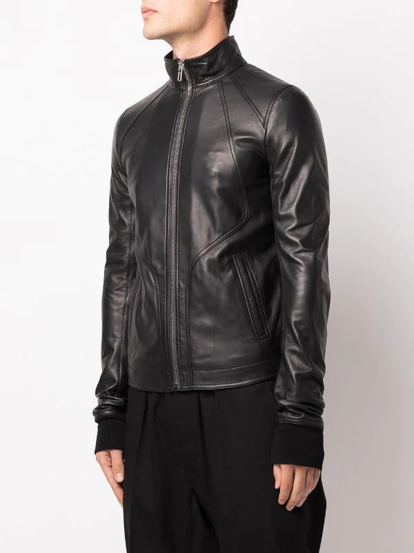Empiècements géométriques, col montant, fermeture zippée devant, manches longues, deux poches latérales fendues. Couleur : noir. Matière : cuir.