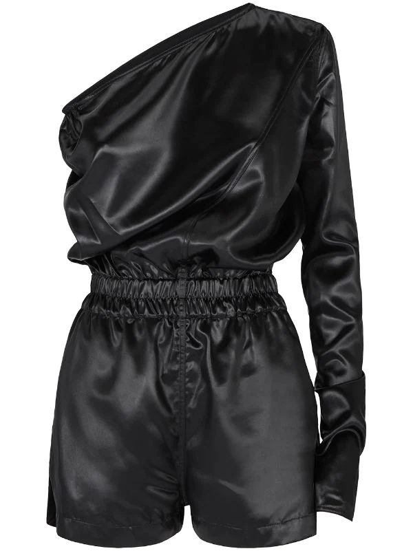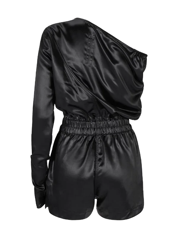 Détails drapés, détails de découpes, design asymétrique à une épaule, manches longues, ceinture élastique, deux poches latérales fendues. Couleur : noir.